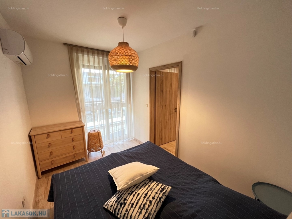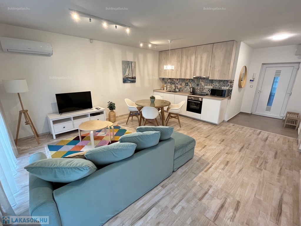 2026.05.31-IG!!! Balatonlellén a központ közelében, - a parttól nem messze - rendezett társasház 1. emeletén található, 48 m2-es - igényesen kialakított és berendezett - modern lakás kiadó. A lakásban előszoba-étkező-nappali, 1 szoba, fürdőszoba-wc helyiségek találhatóak, illetve a nappaliból kilépve nagy terasz is van. A fűtése légkondicionálokkal megoldott, továbbá riasztó is van felszerelve - a lakáshoz tartozik 1 db személyautó részére beállóhely is. A tulajdonos a lakást legfeljebb 2 felnőtt személy részére kívánja bérbe adni, a dohányzás és a kisállat tartása nem engedélyezett. Bérleti díj: 150.000.- Ft/hó + rezsi + 2 havi kaució