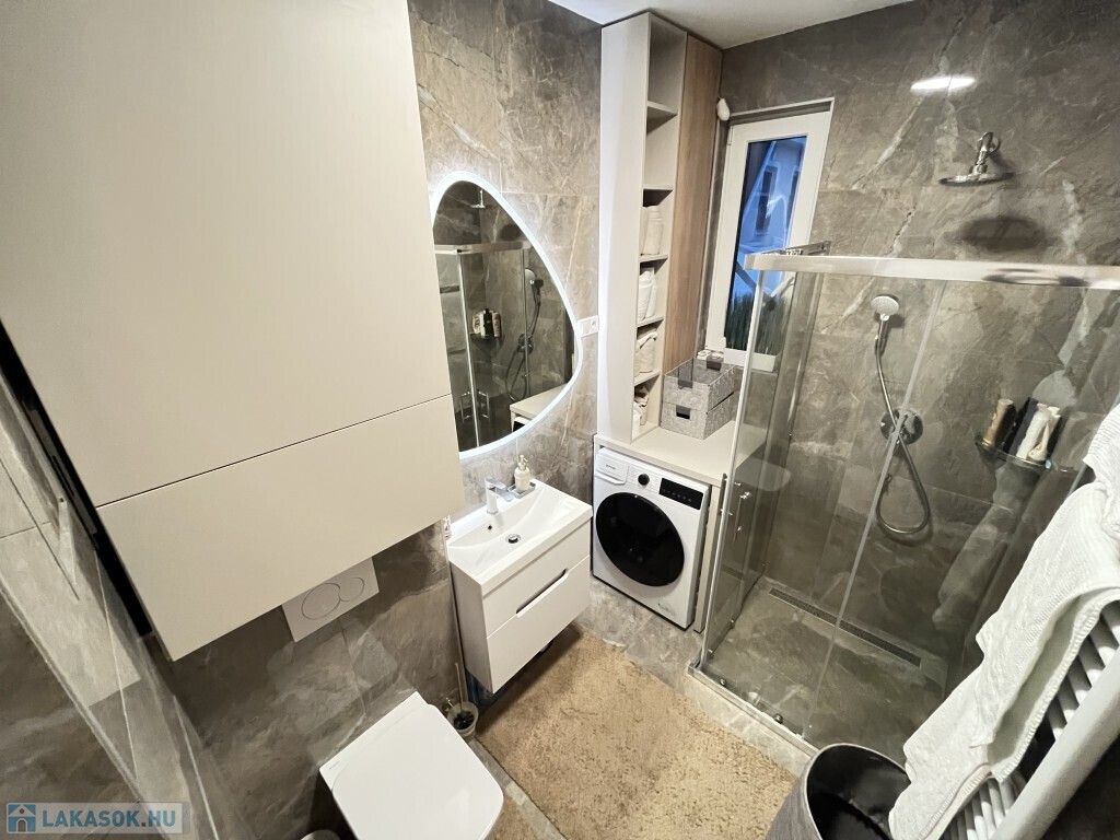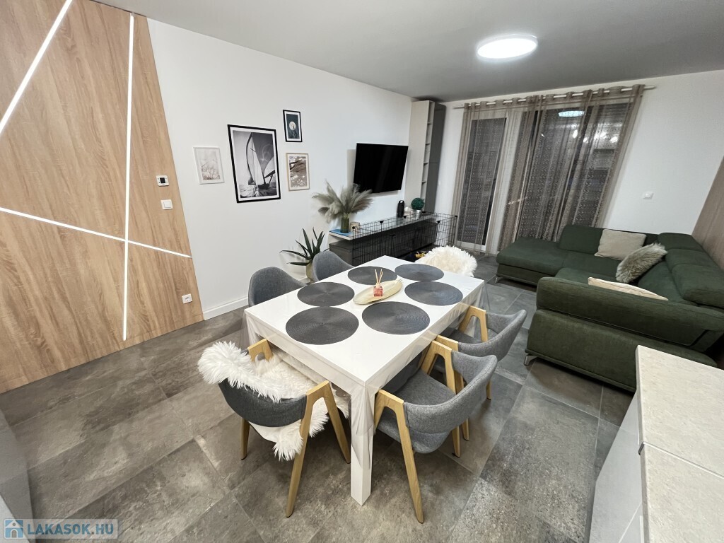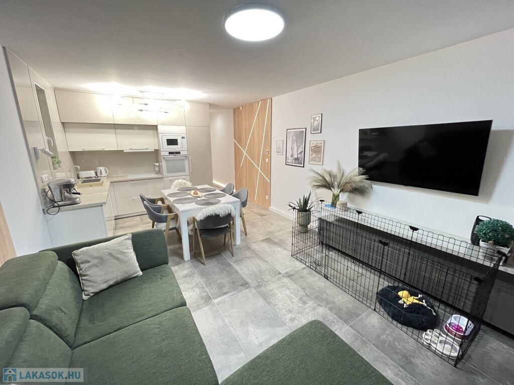 Balatonlellén a központ közelében, - a parttól nem messze - rendezett társasház 1. emeletén található, 59 m2-es - igényesen kialakított és berendezett - modern lakás hosszú távra kiadó. A lakásban előszoba-étkező-konyha-nappali, 1 szoba fürdőszobával (zuhanyzó-mosdó-wc), 1 félszoba, fürdőszoba-zuhanyzó-wc helyiségek találhatóak, illetve a nappaliból és mindkettő szobából kilépve erkély is van. A lakás ideális hőmérsékletéről télen padlófűtés nyáron mennyezethűtés gondoskodik, a meleg víz villanybojlerrel megoldott, továbbá a korszerű műanyag nyílászárók szúnyoghálóval és elektromos redőnnyel vannak felszerelve, illetve riasztó is van. A lakáshoz tartozik 1 db személyautó részére beállóhely is, illetve dupla tároló. A tulajdonos a lakást legfeljebb 2 felnőtt és 1 gyermek részére kívánja bérbe adni, a dohányzás nem engedélyezett, kis állat tartása megbeszélés alapján lehet. Energetikai besorolás: C