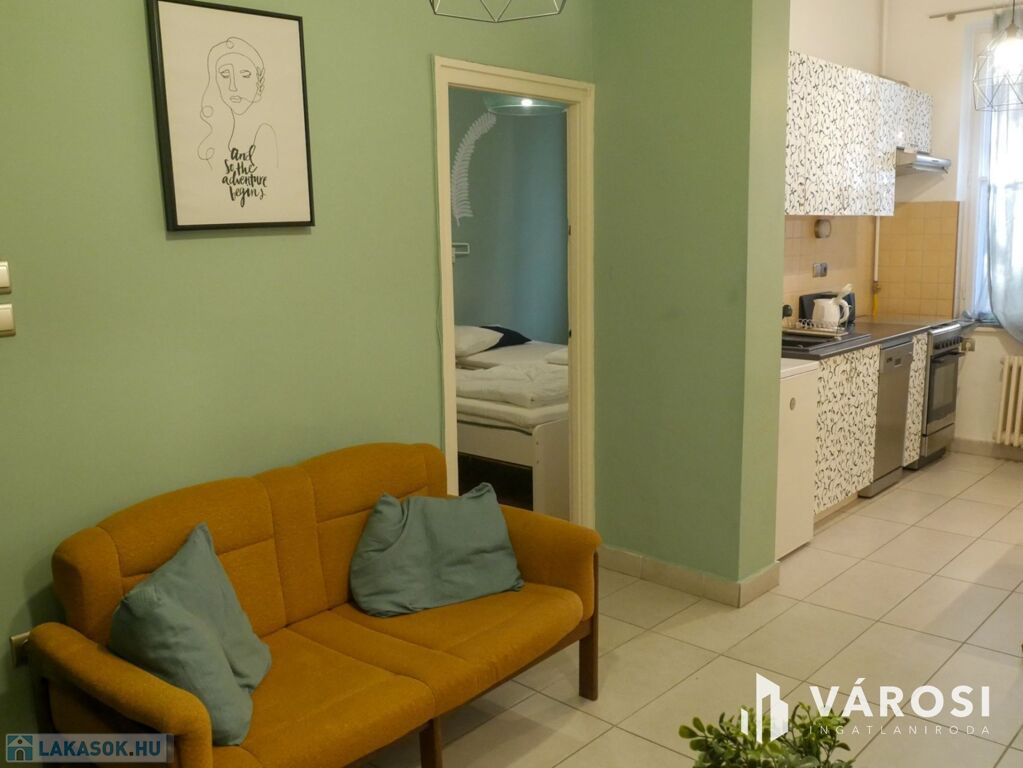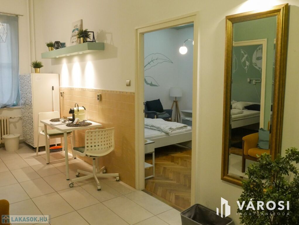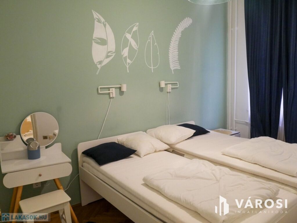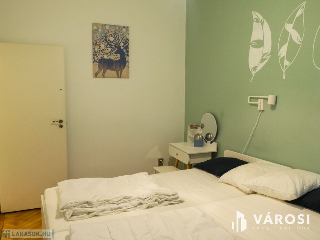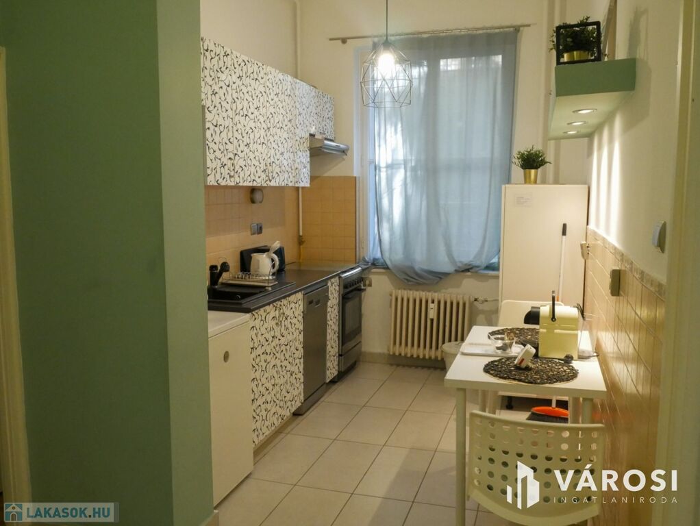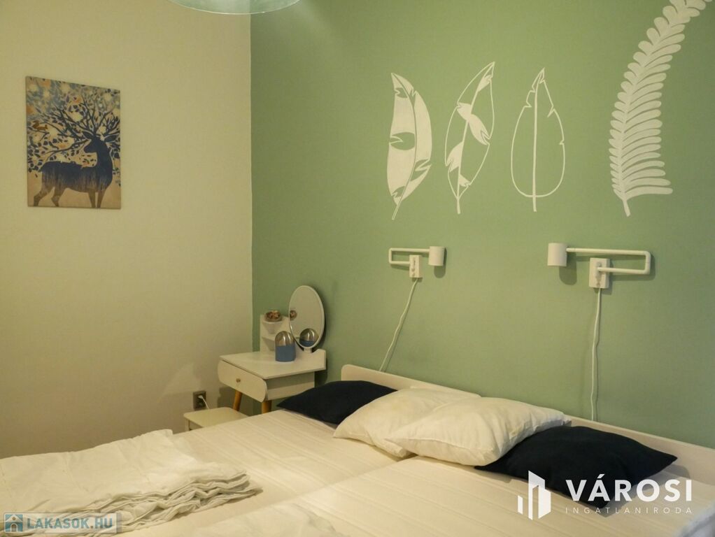 A két szobás lakás bútorozott, ideális három fő számára is. Gépiesített, megtalálható benne hűtőszekrény, mosogatógép, mosógép, és klíma. Külön van fürdőszoba és WC, illetve fürdőkád van beépítve. A zöld falfestés és a képek kifejezetten nyugodt, otthonos hangulatot árasztanak. Az ablakok pedig egy szépen gondozott belső udvarra néznek.