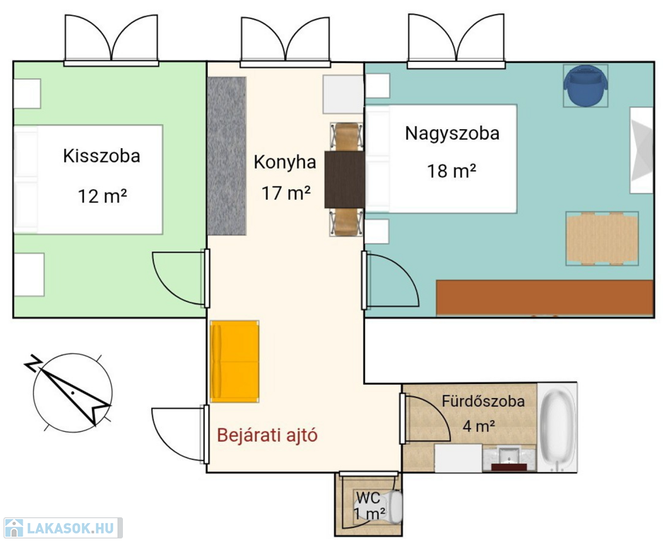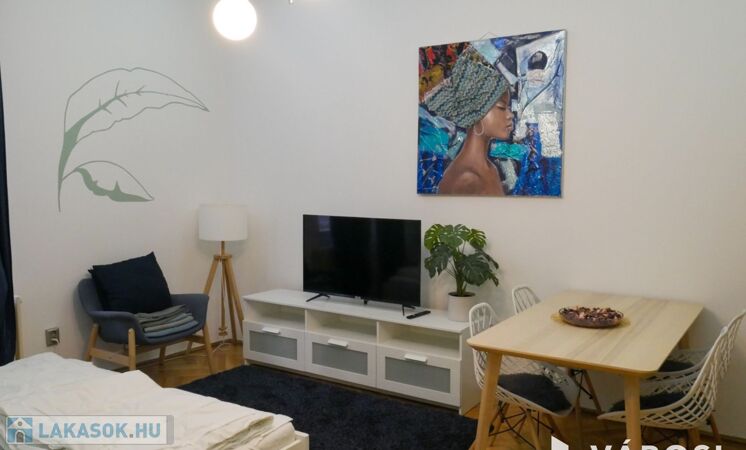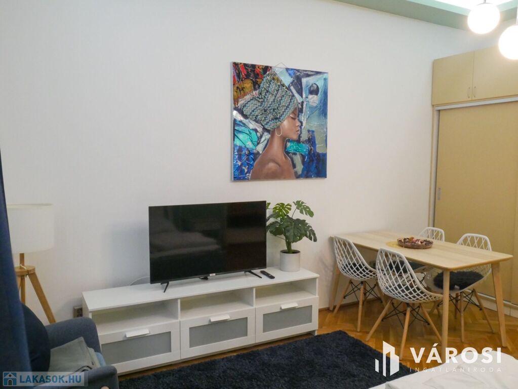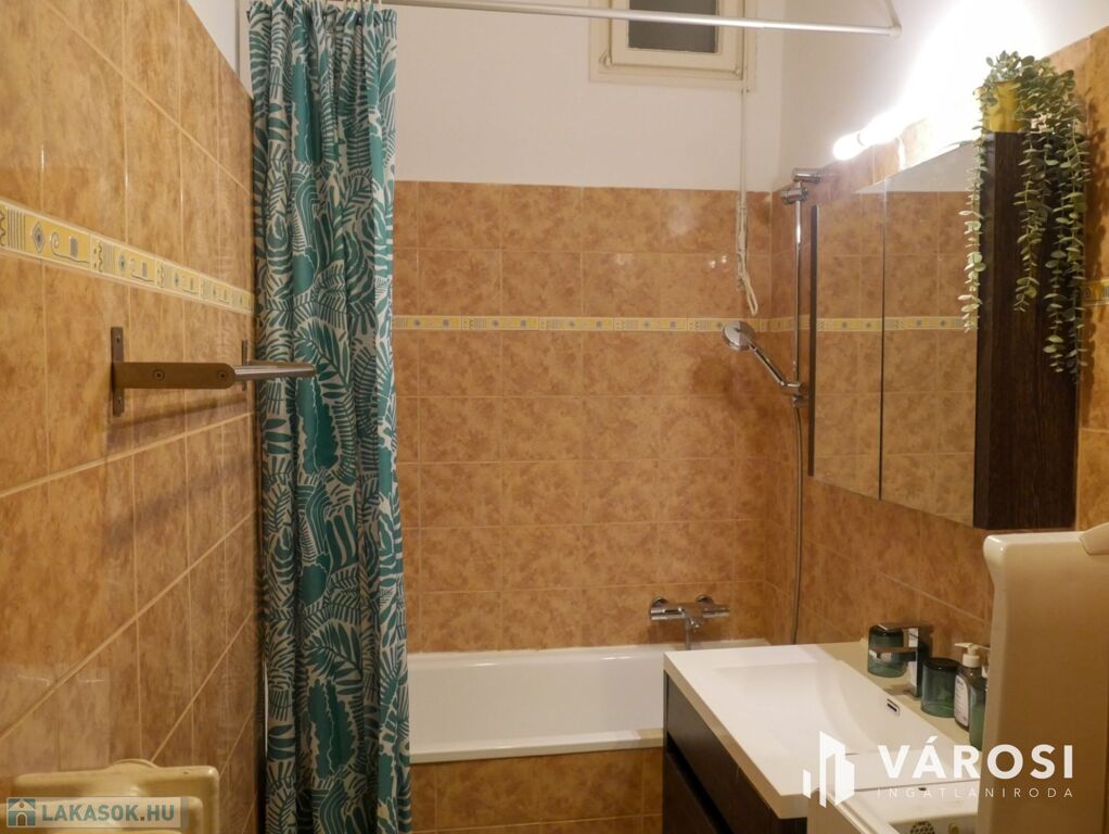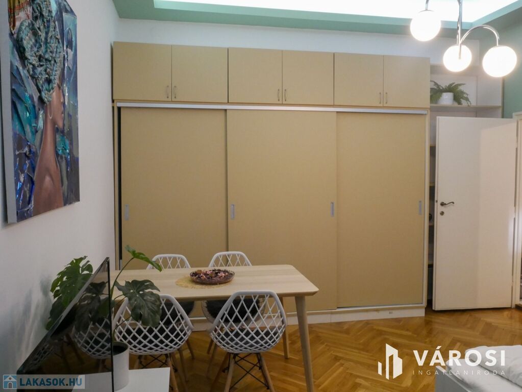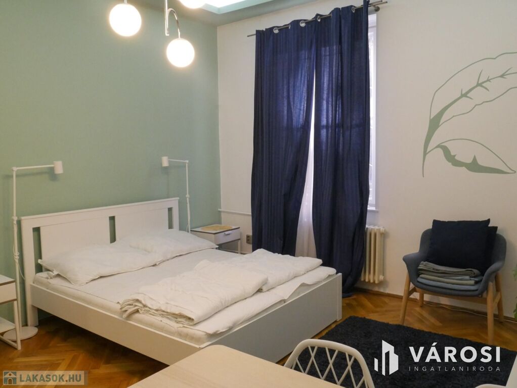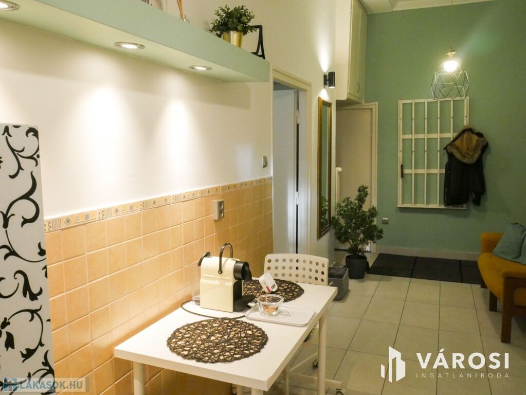 A két szobás lakás bútorozott, ideális három fő számára is. Gépiesített, megtalálható benne hűtőszekrény, mosogatógép, mosógép, és klíma. Külön van fürdőszoba és WC, illetve fürdőkád van beépítve. A zöld falfestés és a képek kifejezetten nyugodt, otthonos hangulatot árasztanak. Az ablakok pedig egy szépen gondozott belső udvarra néznek.