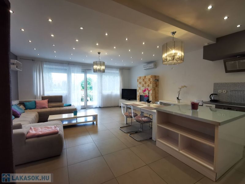 Csendes utcában, délkeleti tájolású, háromlakásos társasház első emeleti lakása kiadó. Erkélykapcsolatos nappalival, 2 hálószobával klímával, fűthető autólejáróval. Szép panoráma van a város felé. A lakáshoz 1 garázshely tartozik.
