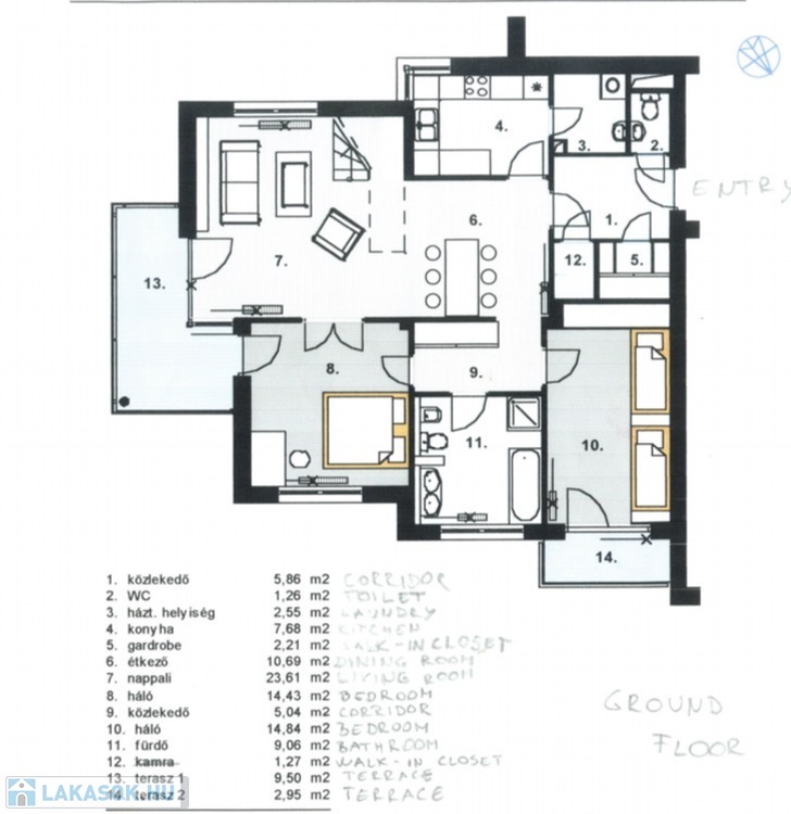 A lakás elosztása praktikus és kényelmes: nappali, 2 hálószoba, külön konyha, duplakomfortos fürdőszoba, valamint két nagy, napos terasz tartozik hozzá. A lakás klimatizált, a fűtésről gázkazán gondoskodik. A bérleményhez teremgarázs-beálló is tartozik, amely kényelmes parkolást biztosít a lakóknak.