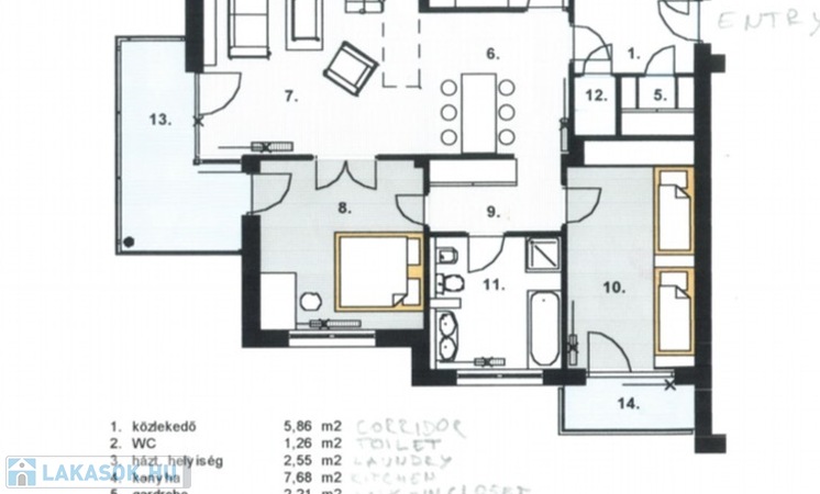A lakás elosztása praktikus és kényelmes: nappali, 2 hálószoba, külön konyha, duplakomfortos fürdőszoba, valamint két nagy, napos terasz tartozik hozzá. A lakás klimatizált, a fűtésről gázkazán gondoskodik. A bérleményhez teremgarázs-beálló is tartozik, amely kényelmes parkolást biztosít a lakóknak.