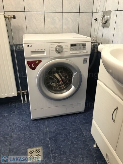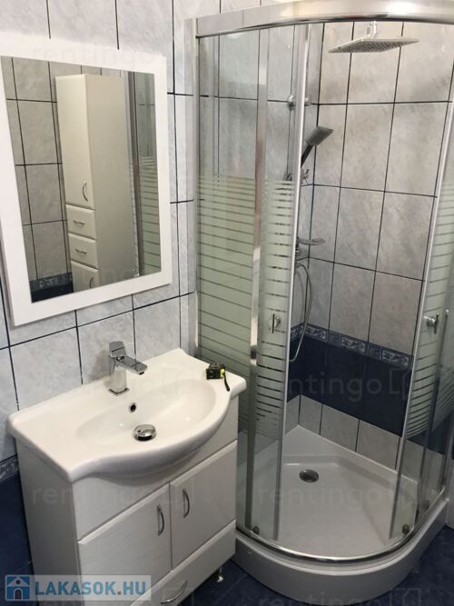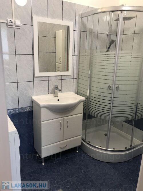 A fürdőszobában zuhanykabin, mosdó, új mosógép.