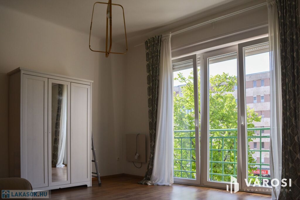A lakás egy 5 emeletes, liftes ház 2. emeletén található. Hatalmas ablaki és francia erkélye délre néznek, így rendkívül világos.