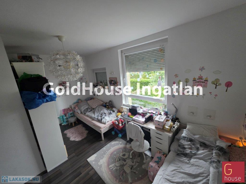 Az alsó szint tágas nappali–étkező–konyha tere egybefüggő, világos élettérként működik, közvetlen kapcsolatban a terasszal és a gondozott kerttel, ahol saját medence, kerti tároló és játszóvár biztosít kényelmet és kikapcsolódási lehetőséget.