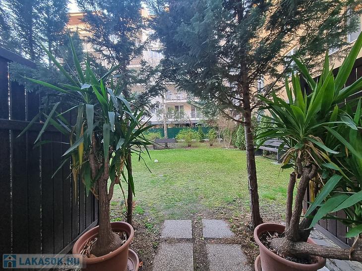 A házhoz zöld, nyugodt közös kert tartozik – ideális pihenéshez egy hosszú nap után