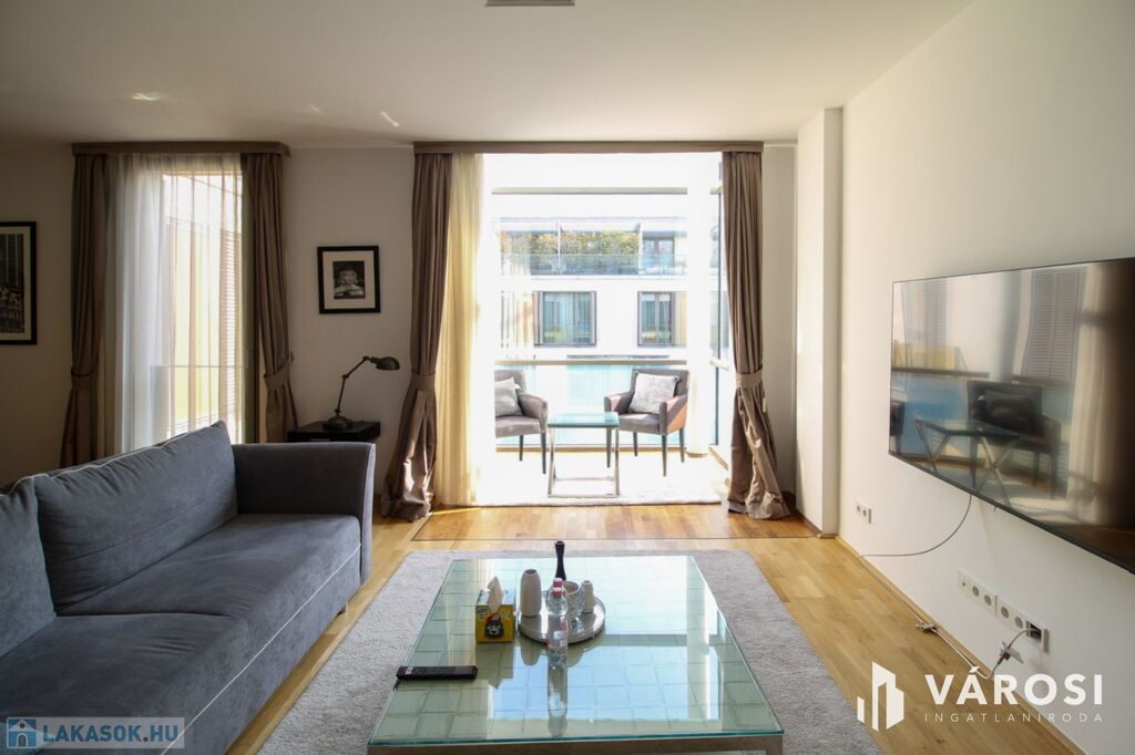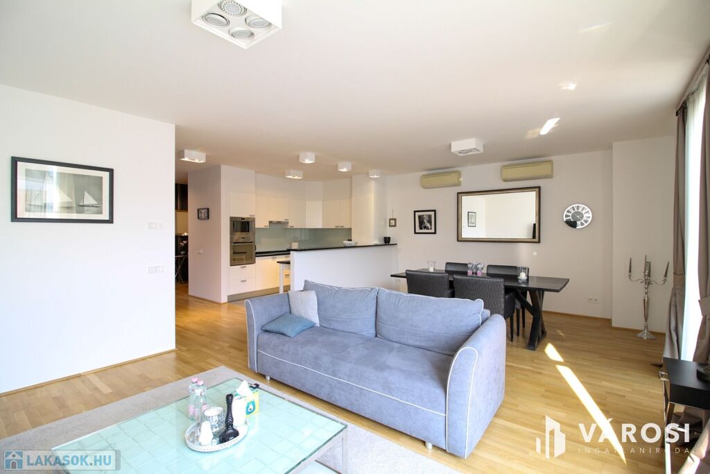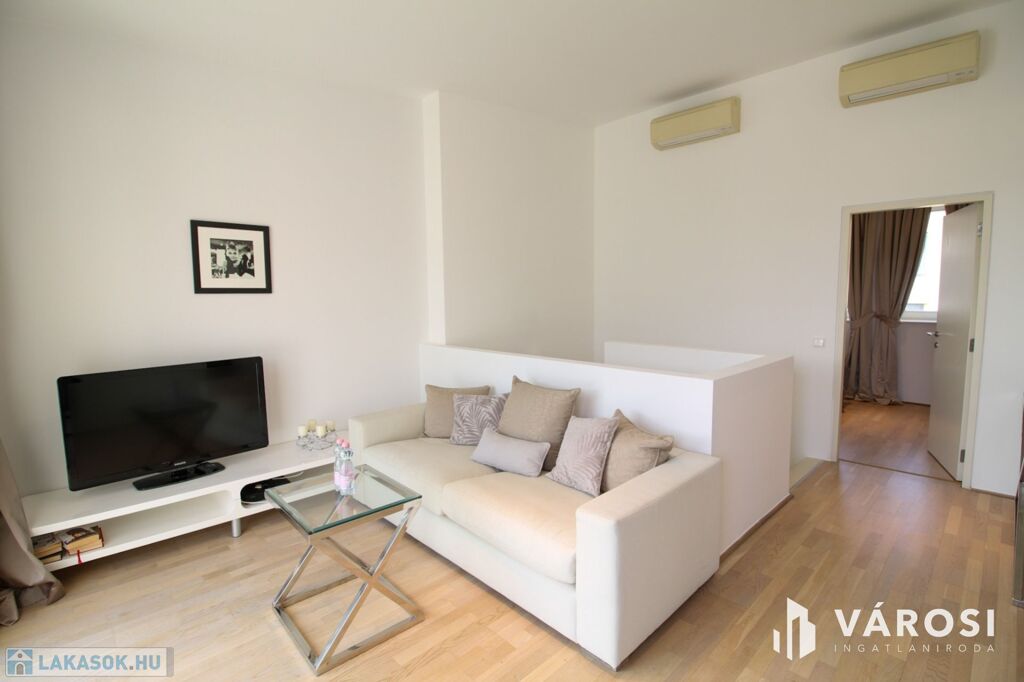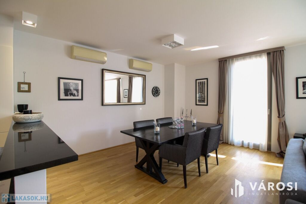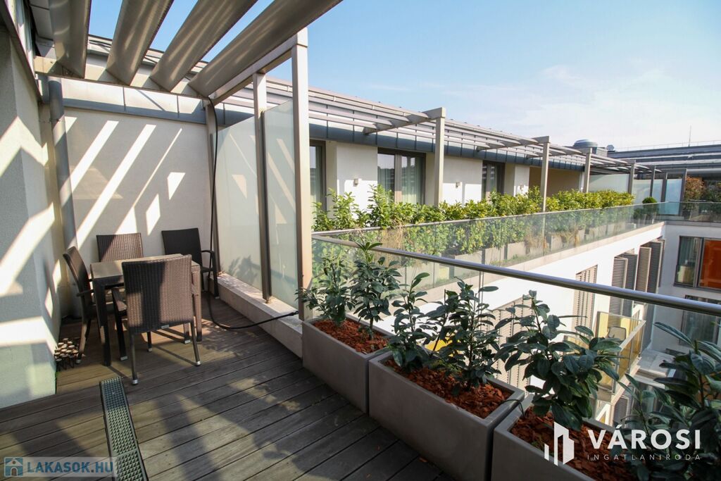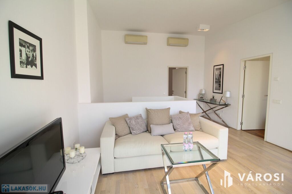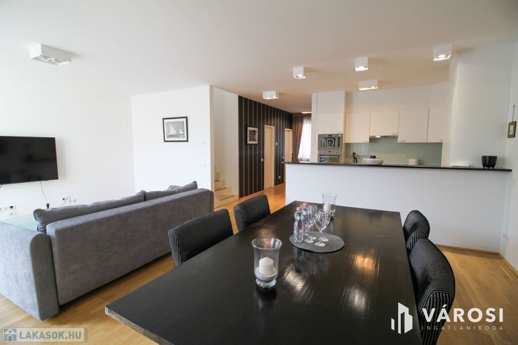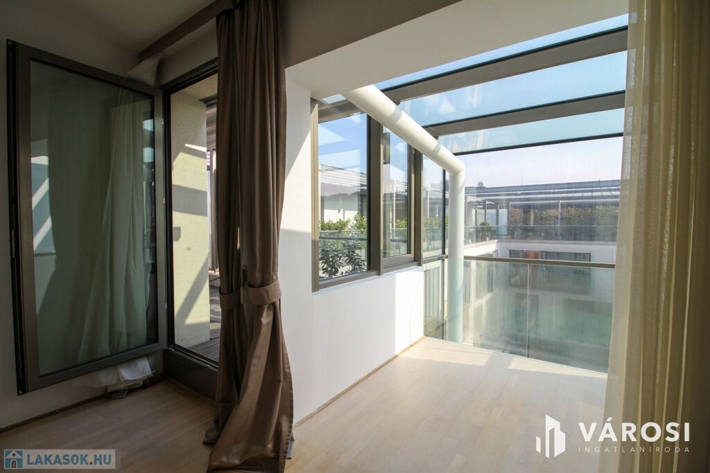 A duplex lakás az épület legfelső, 5. emeletén helyezkedik el, így az üvegplafon varázslatos kilátást enged az égboltra. A 140 m2-en található a bejárati szinten egy tágas és napsütötte amerikai konyhás nappali, egy vendégmosdó és egy tároló helyiség, vagy mosószoba, míg az emeleten van két hálószoba, melyekből külön saját fürdőszoba nyílik (az egyik fürdőkádas, a másik zuhanykabinos), egy panorámás nappali és egy hangulatos erkély. Bútorozottan és gépiesítve várja új bérlőit. A megfelelő hőmérsékletről házközponti fűtés gondoskodik, illetve egyedileg szabályozható fal-, padló-, mennyezetfűtéssel és légkondicionálóval.