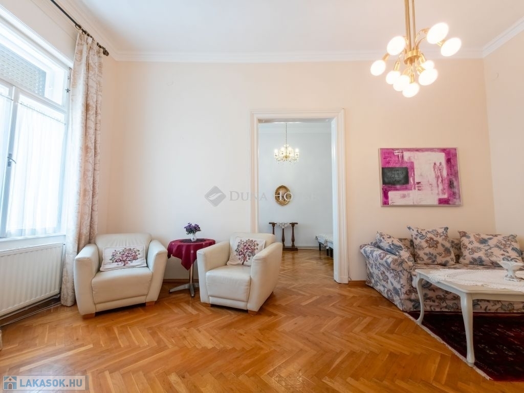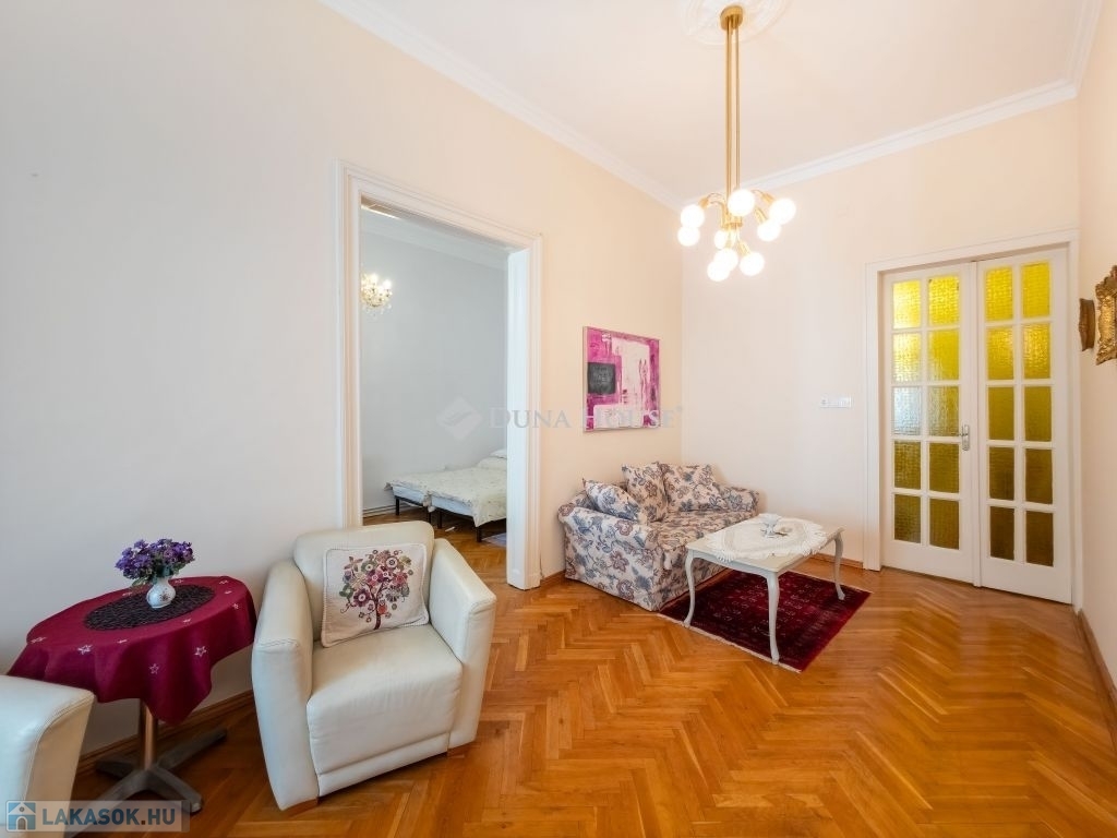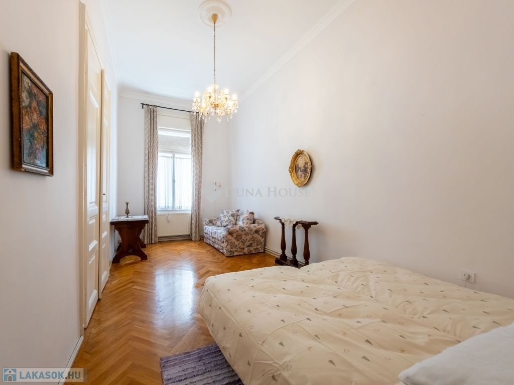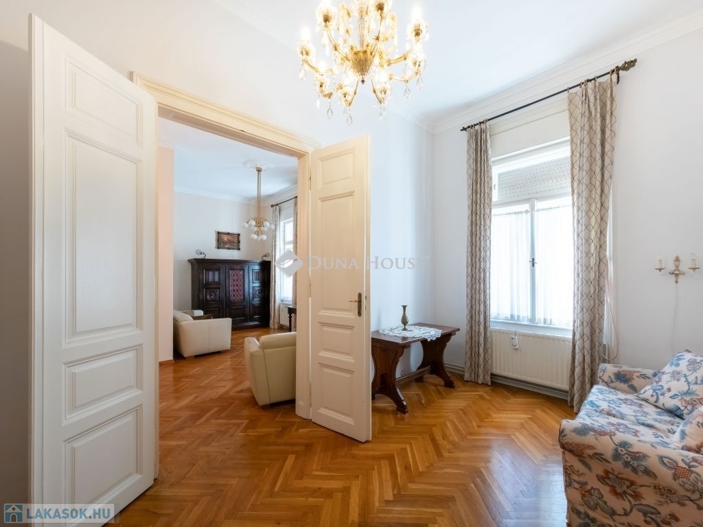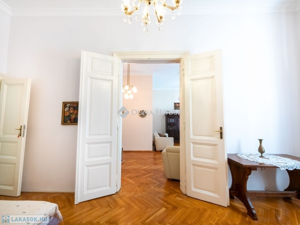 A lakás igazi nagypolgári hangulatot áraszt parkettás padlójával, klasszikus ajtóival és elegáns enteriőrjével.