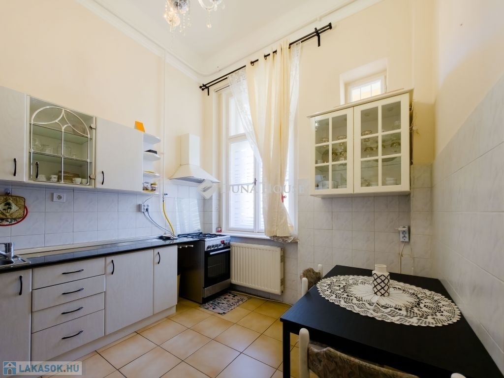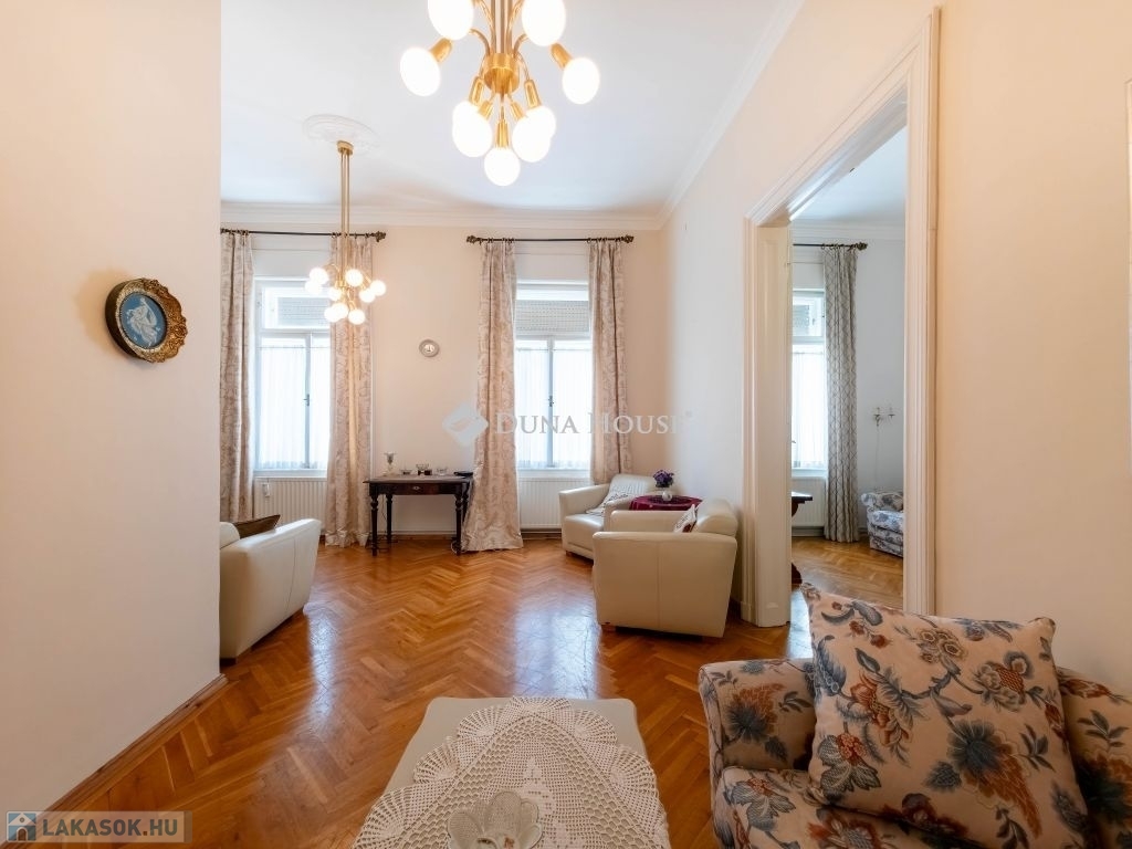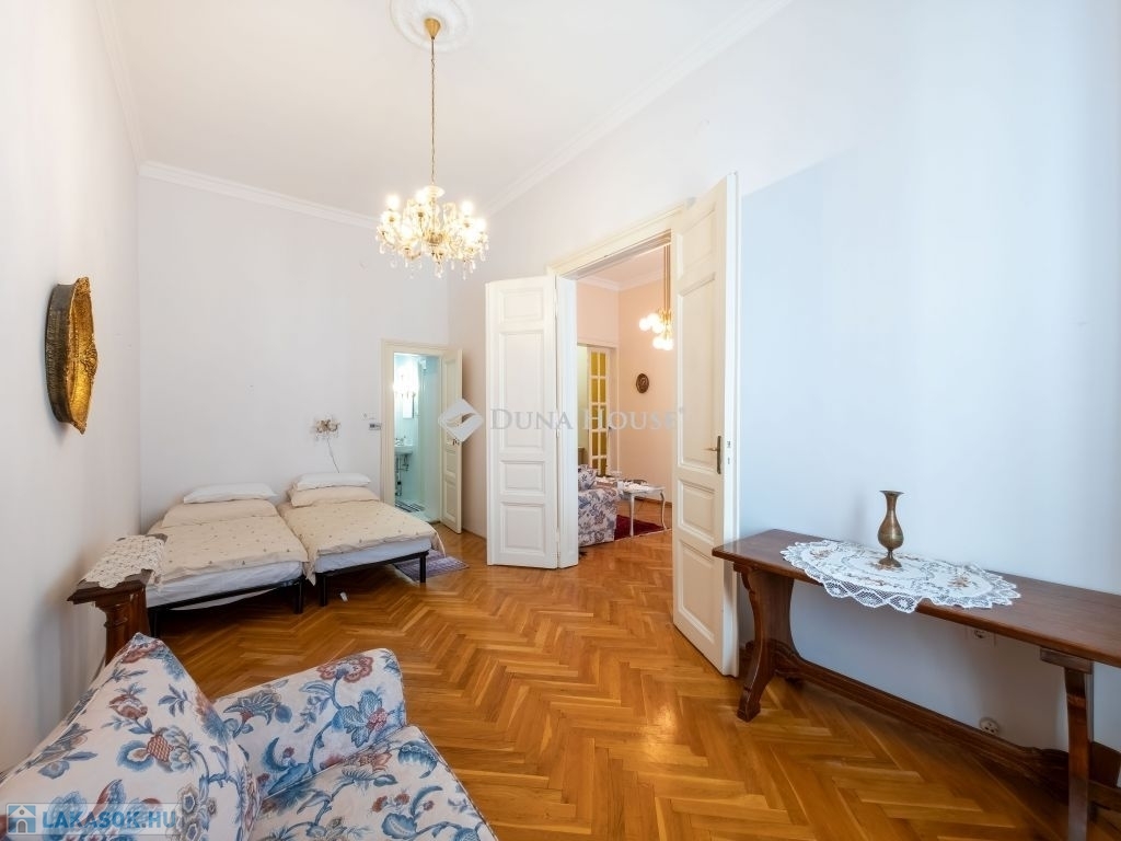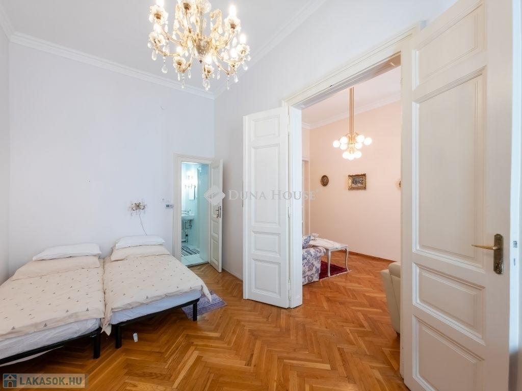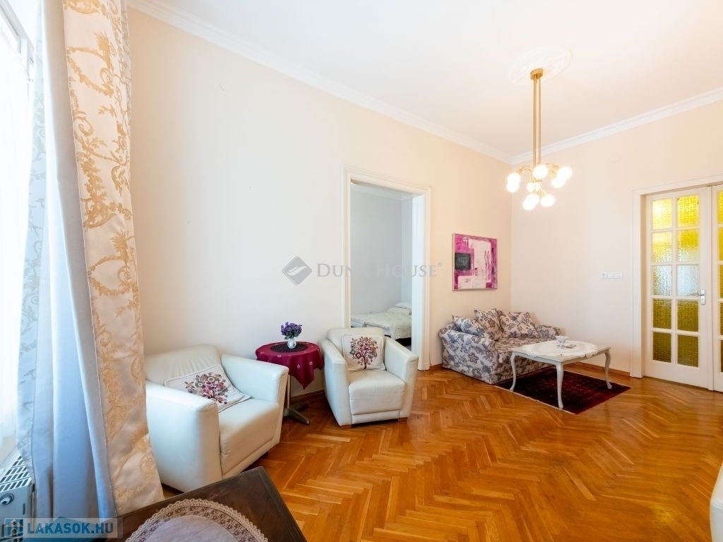 A lakás igazi nagypolgári hangulatot áraszt parkettás padlójával, klasszikus ajtóival és elegáns enteriőrjével.