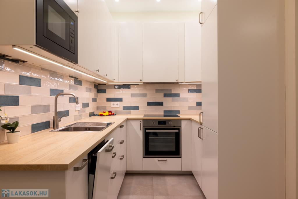 Konyhája gépesített (mosogatógép, mikró, hűtő).