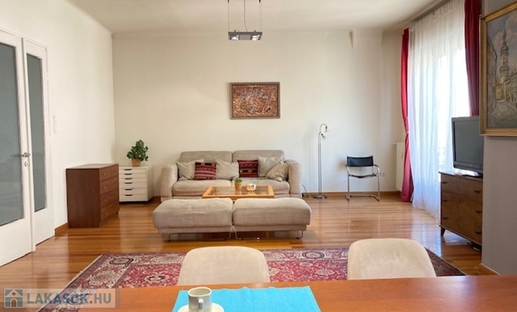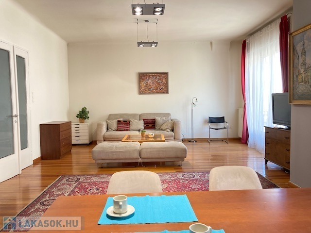 A bright and quiet 83 sqm, 2-room apartment with open-plan kitchen and balcony is available for long-term rent in Budapest’s 5th district, close to the Danube.
