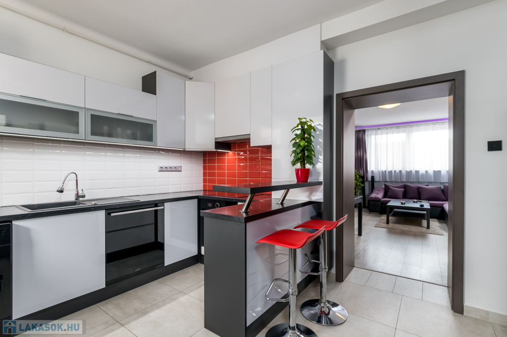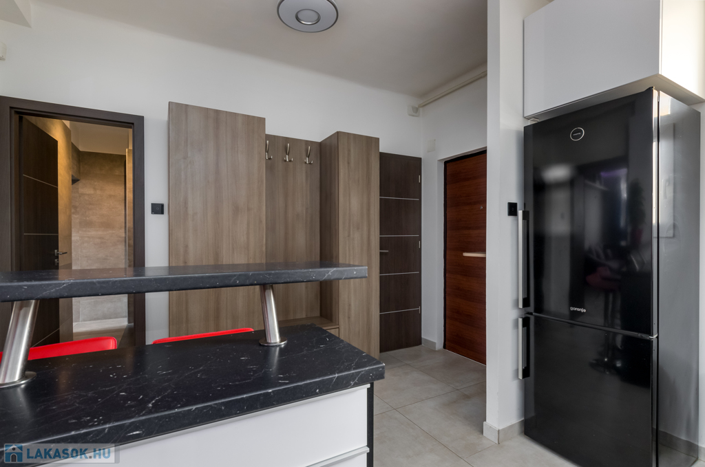 Az ingatlan bútorozott, gépesített: modern konyha új gépekkel felszerelve: indukciós főzőlap, hűtő és mosogatógép.