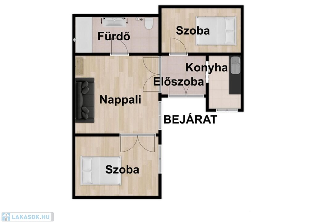-74nm-es lakás(nappali, 2 lakószoba, fürdőszoba, konyha, előszoba)
