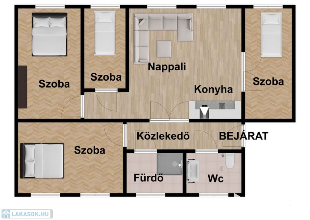-100nm-es lakás(amerikai konyhás nappali, 4 lakószoba, fürdőszoba, kamra, közlekedő és egy különálló wc)