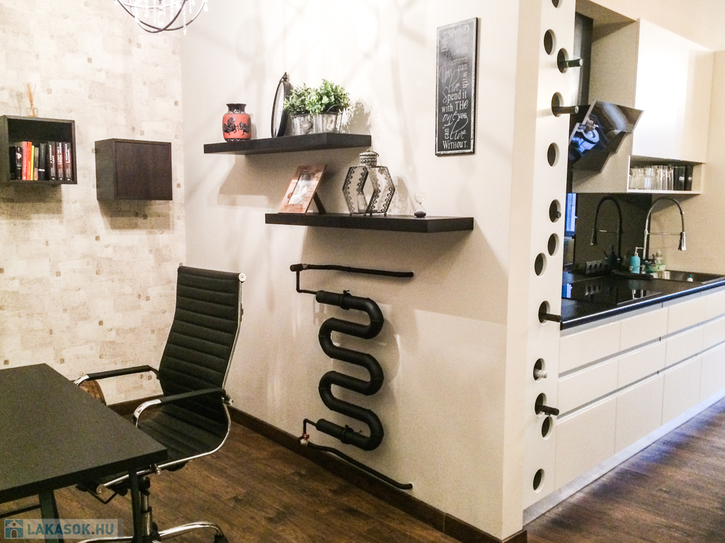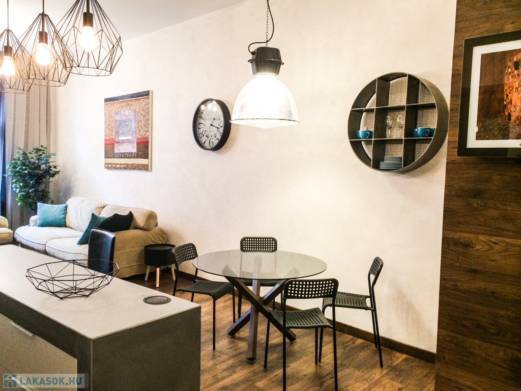 A lakás elrendezése: tágas amerikai konyhás nappali, külön nyíló hálószoba, gardróbhelyiség, dolgozósarok, valamint igényes, külön fürdőszoba.