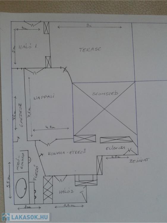 Helyiségek: előszoba, nappali, háló, félszoba, étkezőkonyha, fürdő, gardrób, mosókonyha, terasz