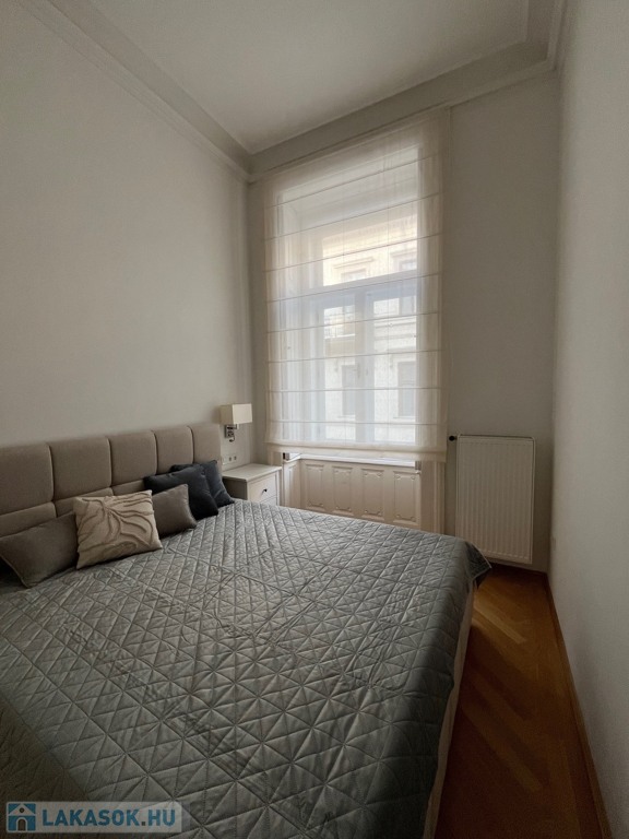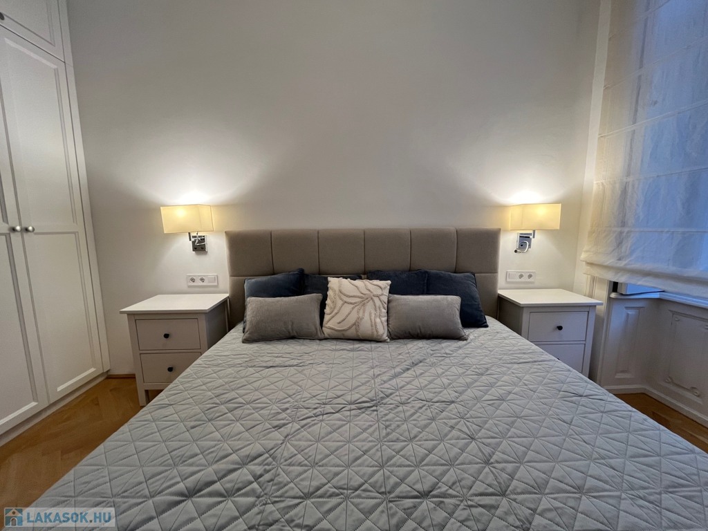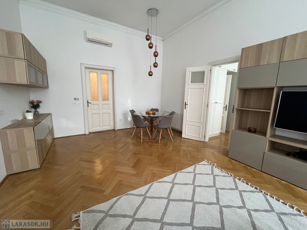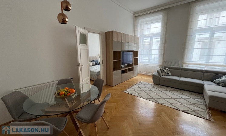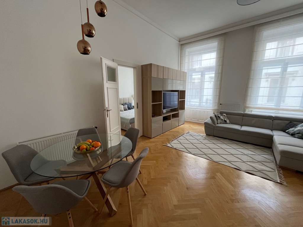 Egy 100 m²-es, gyönyörűen felújított lakásról van szó, egy elegáns, műemlék jellegű ház 2. emeletén (lifttel).