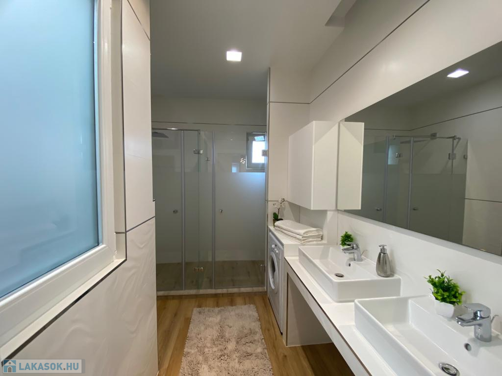 A fürdőszoba elegáns burkolatokkal, két különálló zuhanyzóval és WC-vel rendelkezik, így akár két személy is kényelmesen, egymástól függetlenül készülődhet reggelente. Az ablakos kialakításnak köszönhetően jól szellőztethető.
