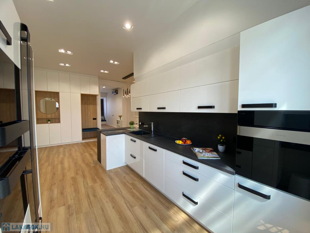 A konyha teljesen gépesített, modern beépített bútorokkal, minőségi készülékekkel (hűtő, fagyasztó, főzőlap, sütő, elszívó, mosogatógép, mikró), ideális hely egy kellemes étkezésre vagy esti beszélgetésekhez.