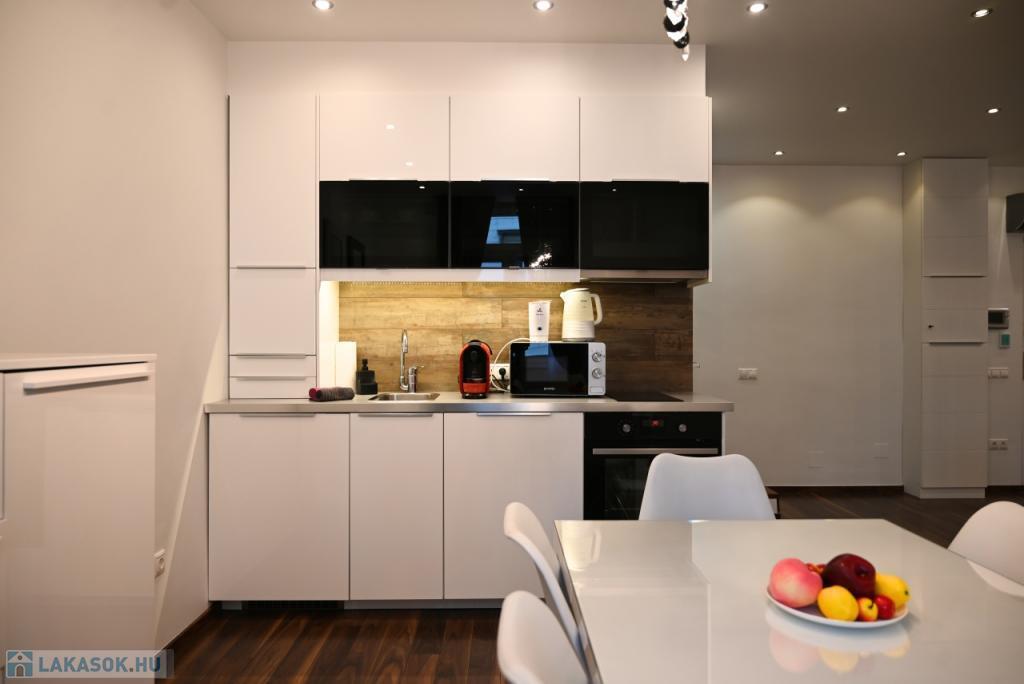 Alsó szint: tágas, amerikai konyhás nappali, beépített bútorokkal és modern gépekkel felszerelve, külön WC kézmosóval.