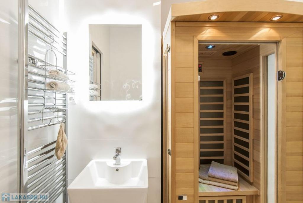 Az infra szaunában a stressztől megszabadulhat, az erkélyről a Parlamentben gyönyörködhet.