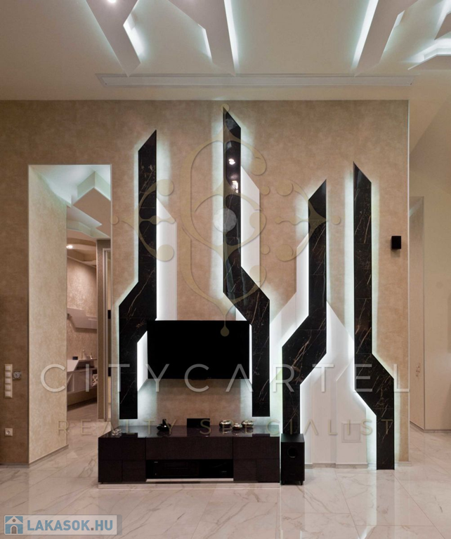 Az egyedi belsőépítészeti megoldások és a gondosan kiválasztott prémium anyagok harmonikus elegyet alkotnak. A LED világítással kombinált faldekorációk és a kézzel készített gipsz mennyezeti díszítések különleges atmoszférát teremtenek. A lakás enteriőrjét olyan neves dizájnmárkák inspirálták, mint a Kare, Bo Concept és Einholtz.