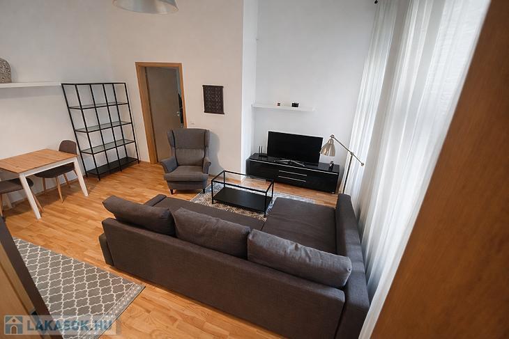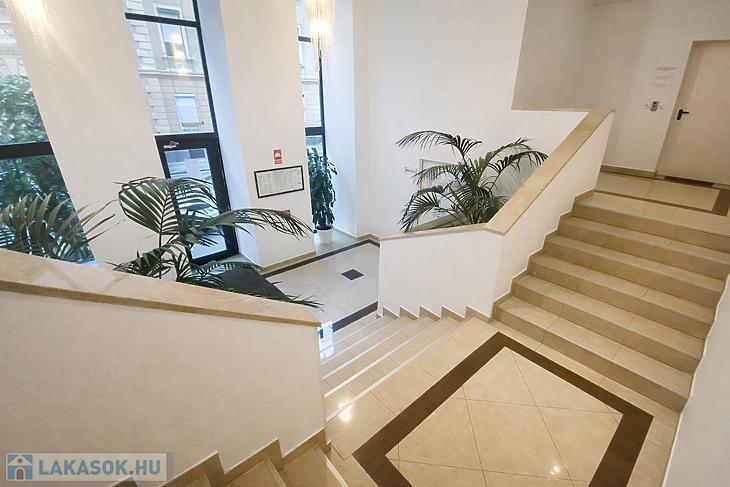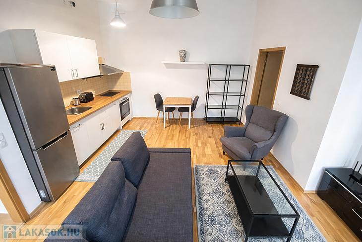 Budapest VI. kerületében, a Vörösmarty utcában, új építésű, modern, portaszolgálatos társasházban kiadó egy 41 m²-es, felújított, világos lakás.