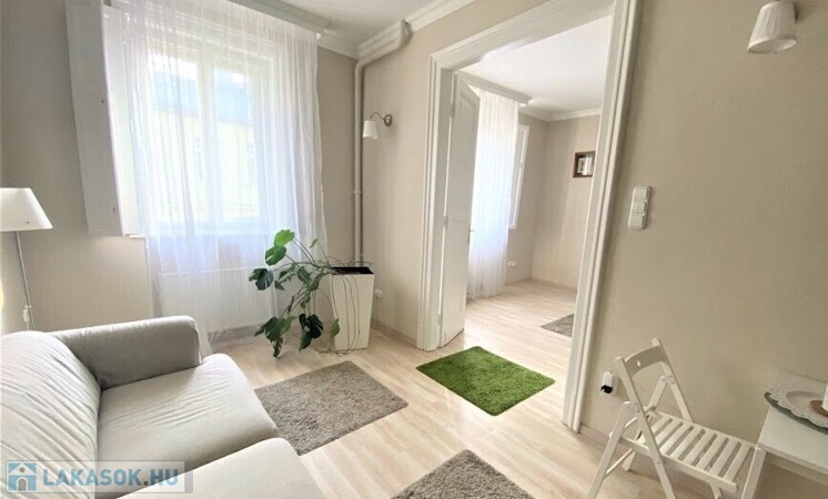 rendezett, liftes, folyamatosan karbantartott ház V.emeletén, egy 65 nm-es, amerikai konyhás nappalis, 2 hálószobás (külön nyílóak) bútorozott, gépesített (mosogatógép, mosógép, hűtő, stb.), belső kertre néző lakás.