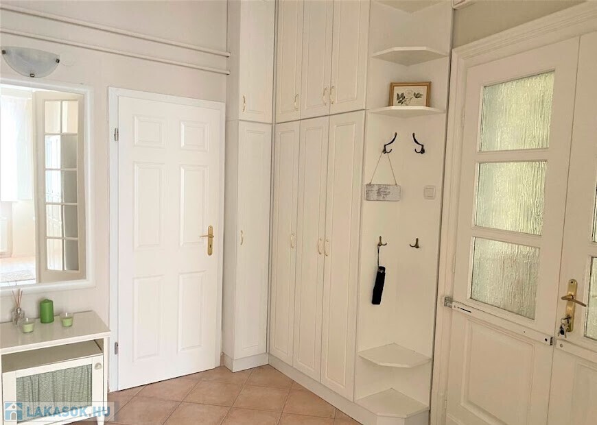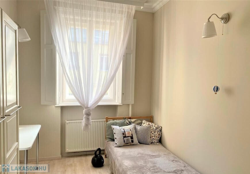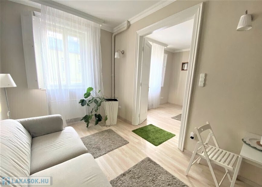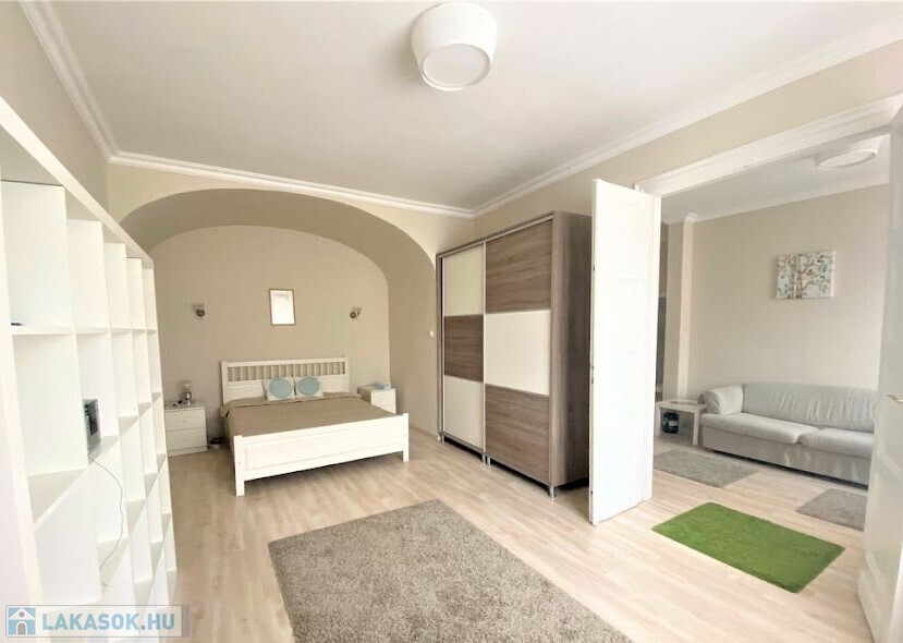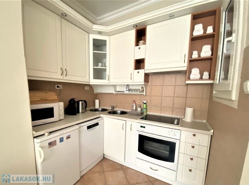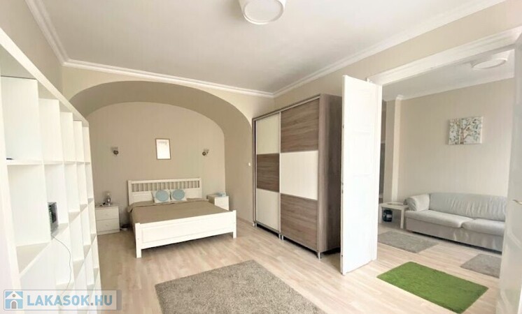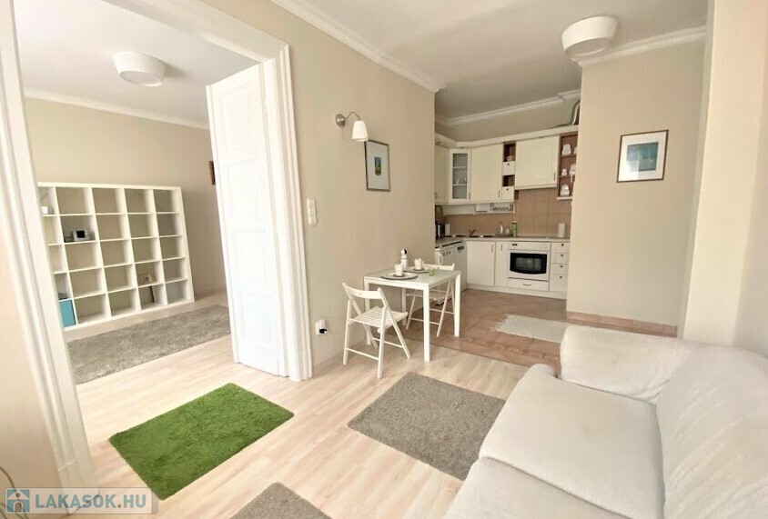 rendezett, liftes, folyamatosan karbantartott ház V.emeletén, egy 65 nm-es, amerikai konyhás nappalis, 2 hálószobás (külön nyílóak) bútorozott, gépesített (mosogatógép, mosógép, hűtő, stb.), belső kertre néző lakás.