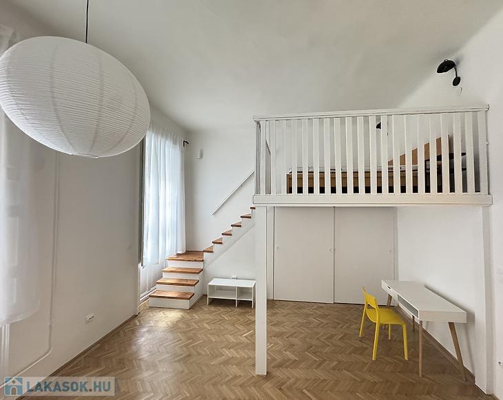 Kiadó 1. emeleti, 41 m²-es, 1 szobás, galériás lakás a Dob utca 68. szám alatt, egy csendes, kevés lakóval rendelkező társasház első emeletén.