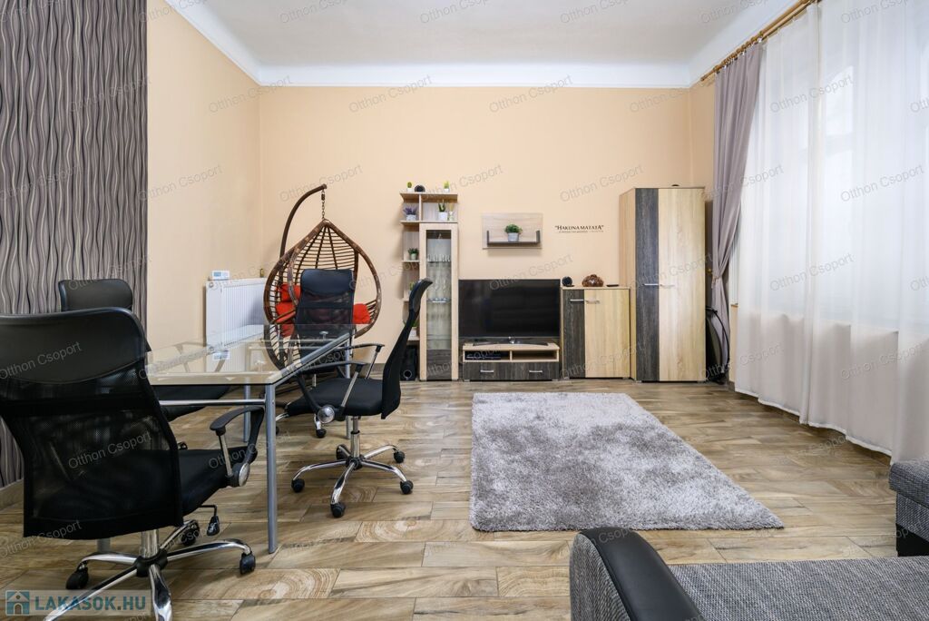 · Világos nappali kihúzható kanapéval, étkezővel, függő fotellel és dolgozósarokkal (íróasztal + irodai szék)