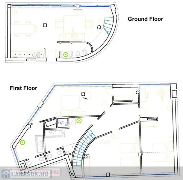 * Felső szint: 3 hálószoba, 2 fürdőszoba, gardrob szoba; belmagasság: 3.00 m