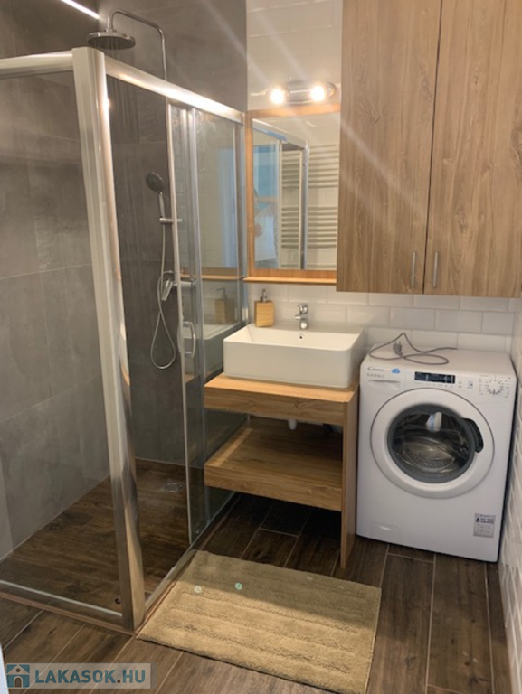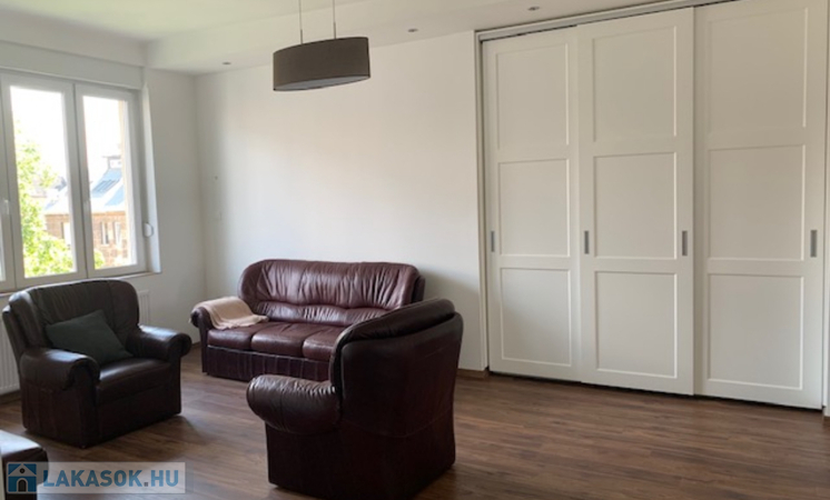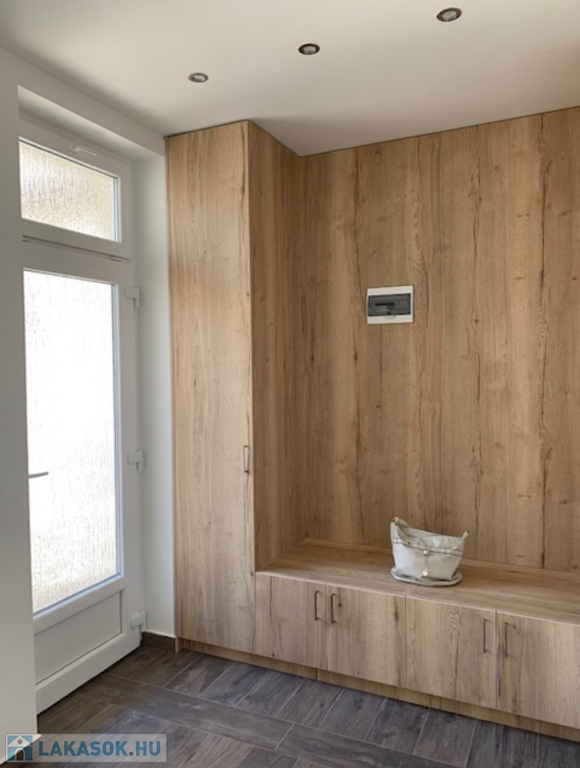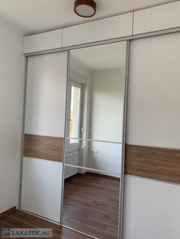 A lakás csendes-világos, gépesített, részben bútorozott, de hatalmas beépített szekrényekkel rendelkezik.