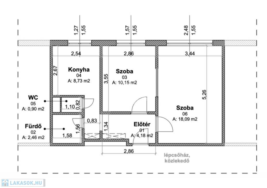 Helyiségei: előszoba, konyha, nappali, szoba, fürdőszoba, WC.