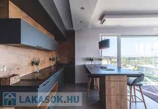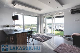 A lakás különlegessége a 60 m²-es, körpanorámás terasz, mely elektromos pergolával felszerelt, és ritka, magashegyi jellegű kilátást biztosít.