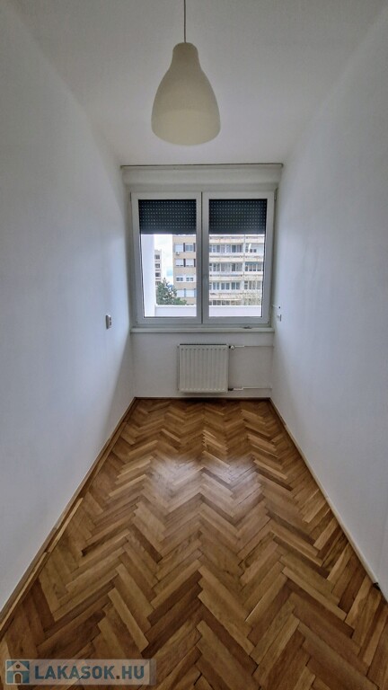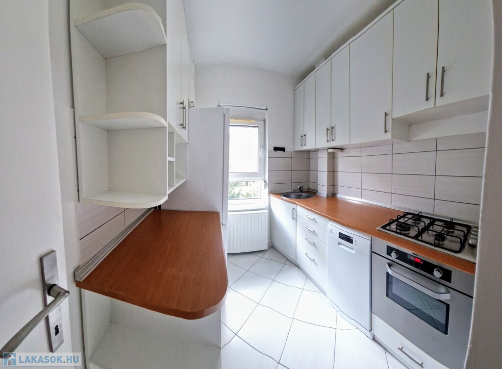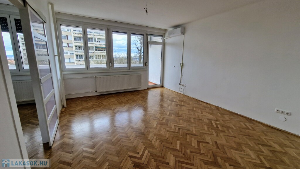 Csúszózsalus, 9 emeletes, liftes társasház első emeletén található, 1,5 szobás, nagy erkélyes, házközponti fűtéses. A bejárati ajtón belépve az előszobába érkezünk, ahonnan jobbra és balra nyílik a konyha és a fürdő-WC. A konyha ajtóval zárható, valamint ablakkal rendelkezik. Egyedi beépített konyhabútor biztosítja a jó helykihasználását, fagyasztós hűtő, gáz főzőlap, a légkeveréses sütő, valamint a teljesen új 9 terítékes mosogatógép pedig a kényelmet. A fürdőszobában található a felültöltős mosógép (szintén új), új zuhanyfülke termosztátos csapteleppel, valamint a WC. A melegvizet 1 éves villanybojler szolgáltatja. Az előszobából nyílik a nappali, mely rendkívül világos a hatalmas ablakoknak köszönhetően. Itt került elhelyezésre a légkondicionáló, valamint innen nyílik a 9 négyzetméteres erkély, mely a lakás teljes szélességében végigfut. A nappaliból nyílik a félszoba, mely háló vagy dolgozó szobának is kiválóan alkalmas, s egy tükrös beépített gardróbot tartalmaz. A lakáshoz tartozik egy kb. 2 négyzetméteres tároló a ház pincéjében.