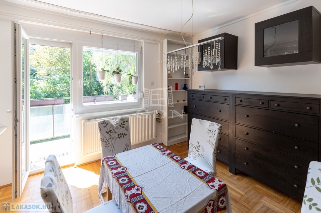 Az ingatlan az első emeleten helyezkedik el és kertre néző kilátást nyújt.
