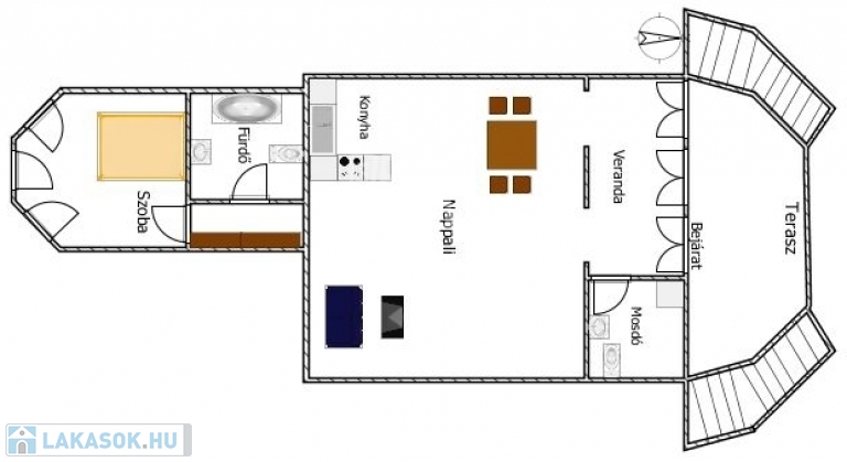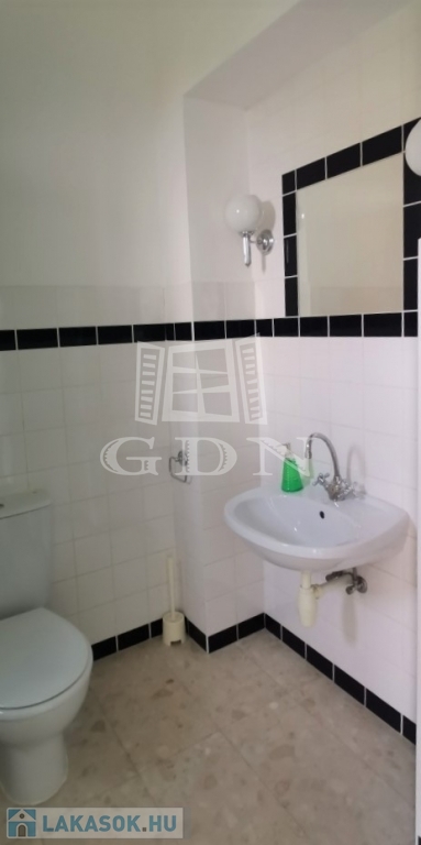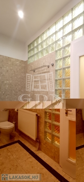 A fürdőszoba a nappali és hálószoba között található, a bejárat mellett külön háztartási helyiség WC-vel és kézmosóval. Fűtés: cirkó kazán.