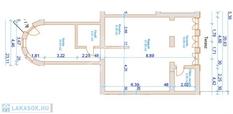 A nappali, konyha és étkező keleti tájolású, kertre néző, innen nyílik a terasz is.