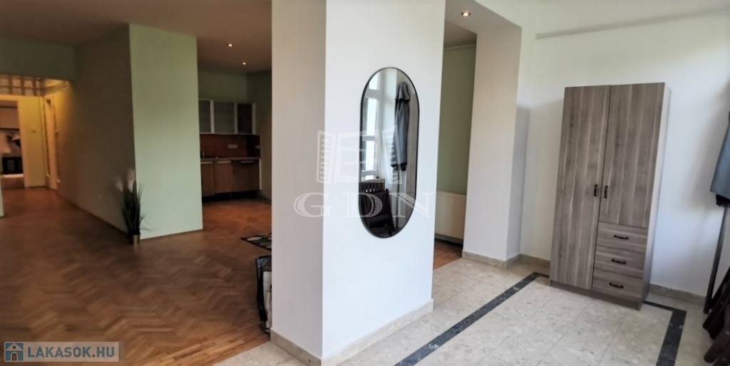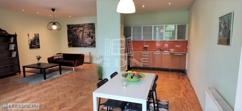 A lakás bútorozott, gépesített konyhával és mosógéppel felszerelve.