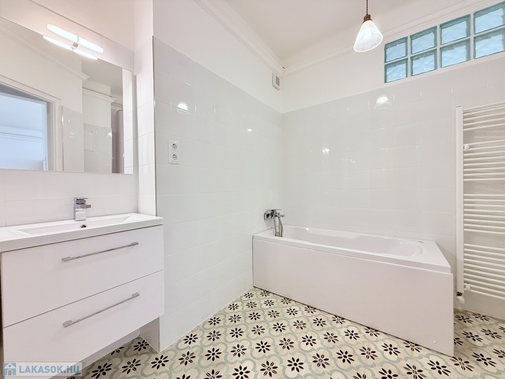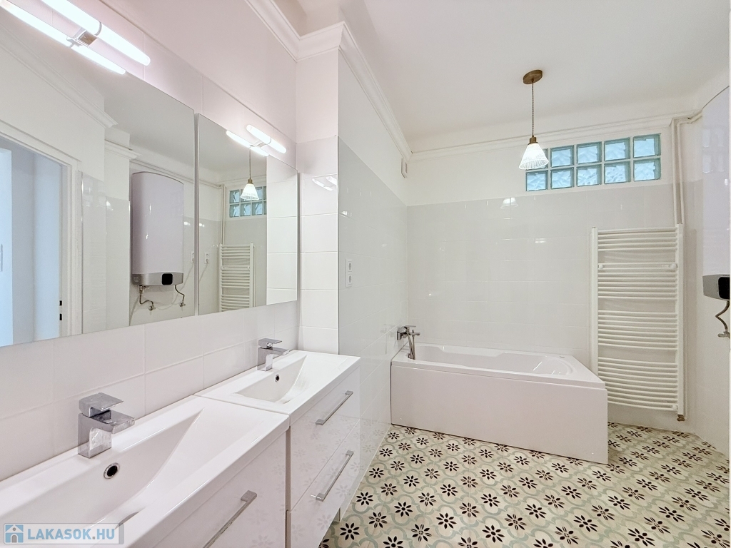 A fürdőszoba kádas kialakítású, törülköző szárítós radiátorral, fiókos szekrényekkel épített mosdókkal felszerelt, ahol a lakás meleg víz ellátását biztosító, új villanybojler is helyet kapott.