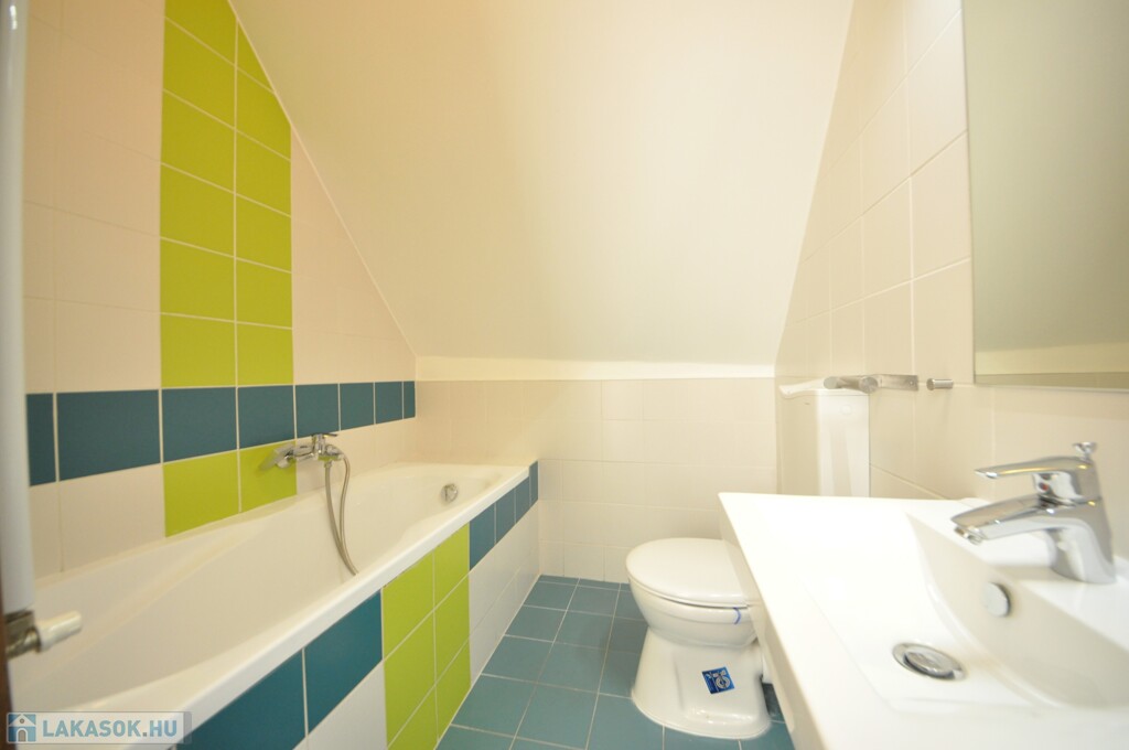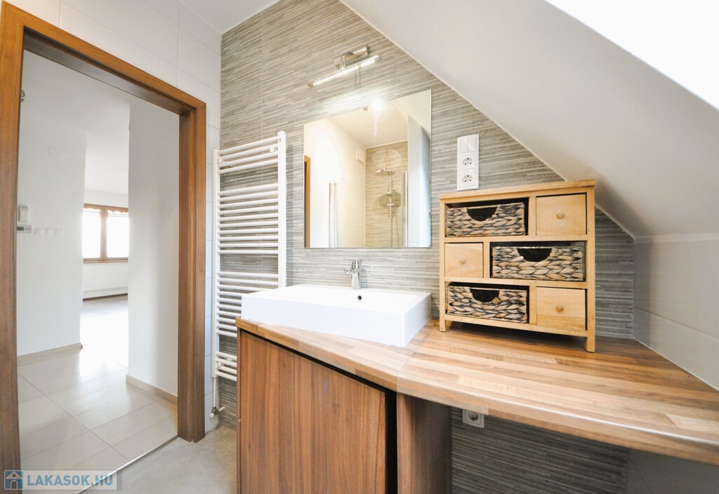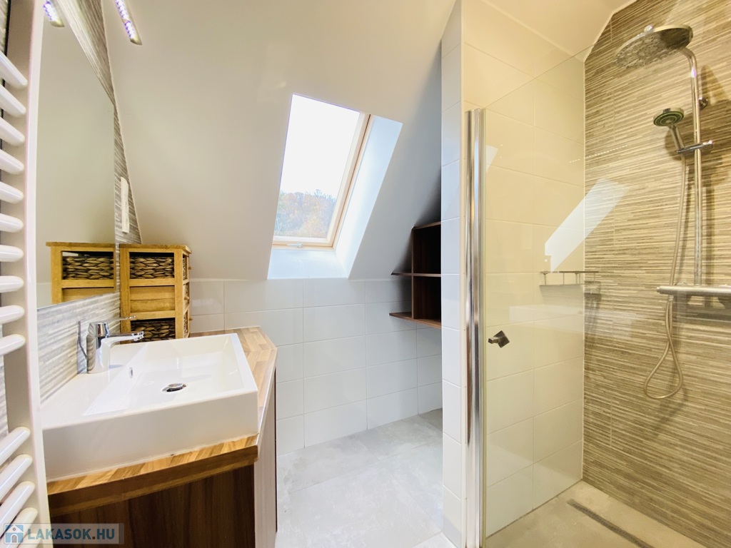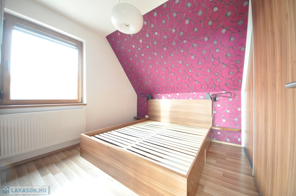 A felső szinten egy közlekedődből nyílik a lakás minden további helyisége, a kádas fürdőszoba, valamint két, jól használható méretű hálószoba.