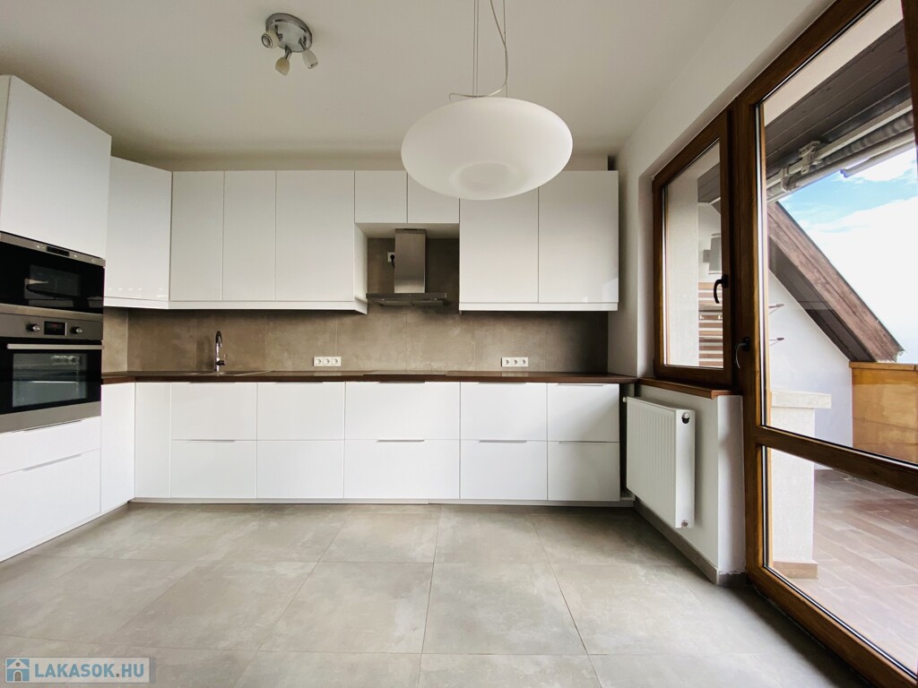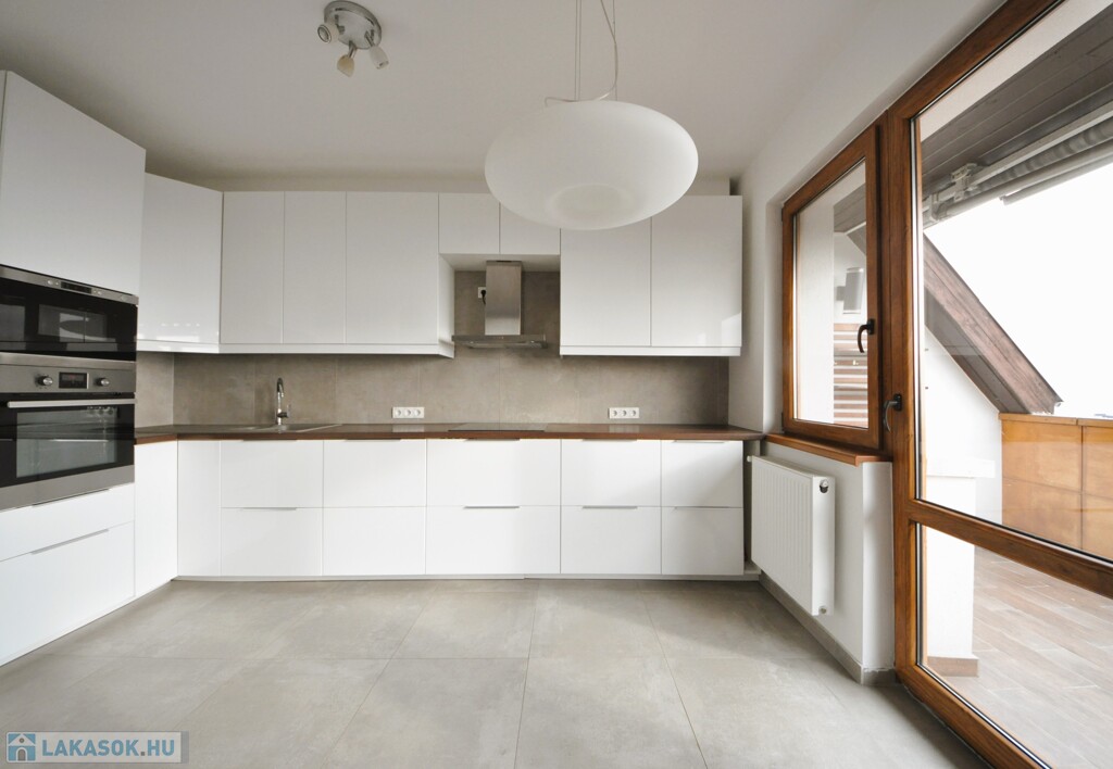A konyhában magas fényű fehér frontokkal épített konyhabútor került, valamennyi háztartási géppel felszerelve (elektromos főzőlap, sütőtoronyba épített sütő és mikró, teljesen integrált mosogatógép, gránit mosogató tálca, inox páraelszívó, valamint a beépítésre kerülő szintén inox fagyasztós hűtőszekrény.