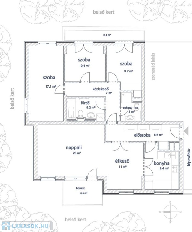 XII. MOM-Lakópark EXKLUZÍV a LAKÓPARKI BELSŐ ZÖLDKERTI épületének 4. EMELETI 4-SZOBÁS (34nm nappali és étkező tér + 3 hálószoba) 109 nm alapterületű NAPFÉNYES KLÍMÁS LUXUS LAKÁSA a nappaliból LAKÓPARKI ZÖLDKERTRE néző TERASSZAL (kb. 6,6nm), 2 szobából a lakóparki zöldkertre nyíló és sétány felé PANORÁMÁS TERASSZAL (5,4 nm), kiadó.