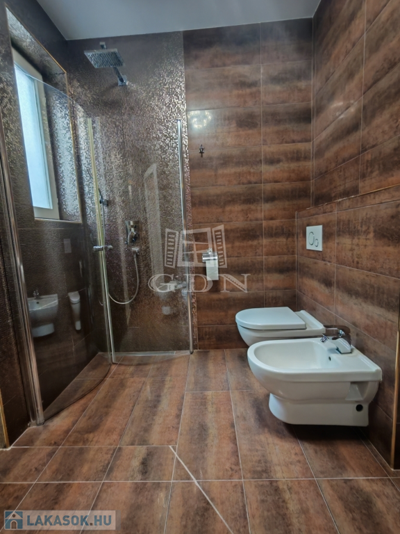 Gardróbhelyiségből nyíló fürdőszoba, amely zuhanyzóval, WC-vel és bidével felszerelt.