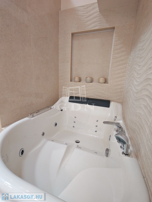 Egy exkluzív kétszemélyes pezsgőfürdős kád és épített üveg zuhanyzó is helyet kapott egy légtérben. Illetve a márvány mosdó ahol a vizcsap nyitására felkapcsol a lámpa!