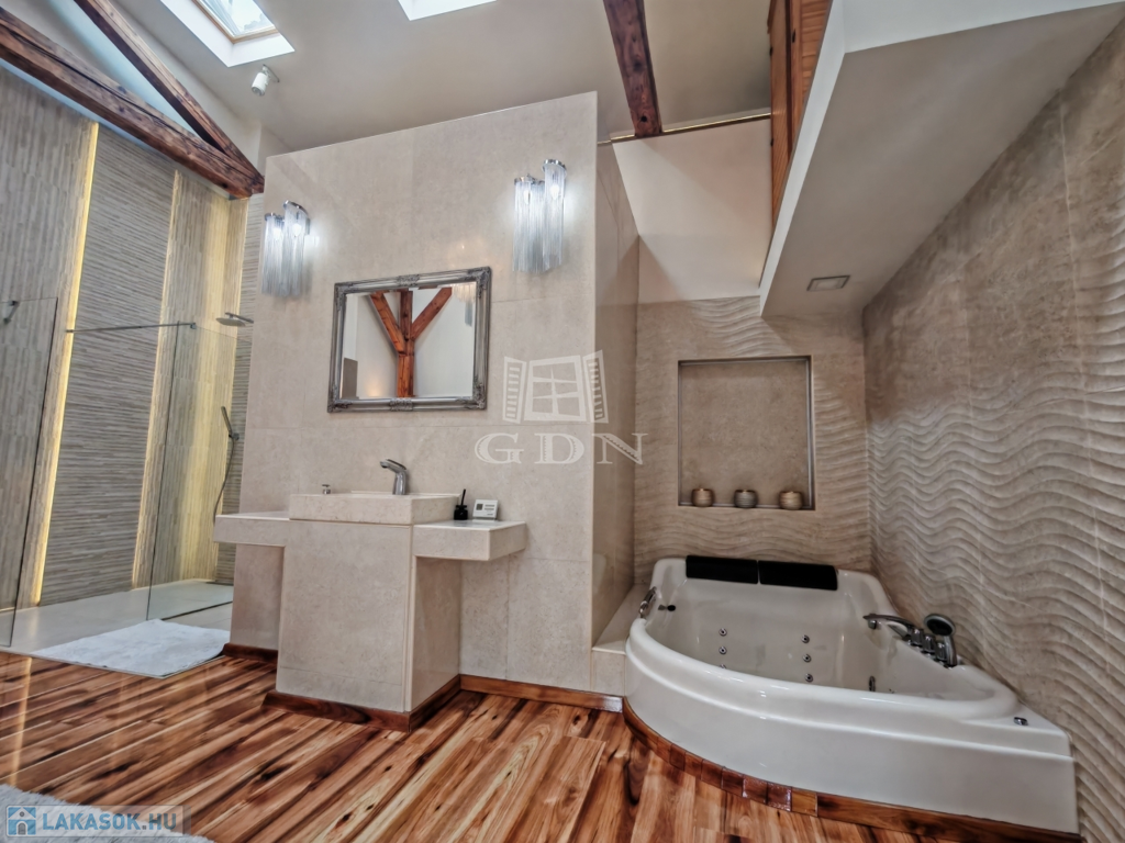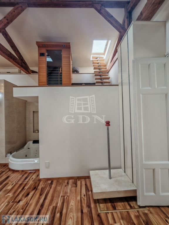 Ebből a különleges hangulatú hálószobából belső személyi lift visz fel az infraszaunához. Innen néhány lépcsővel elérhető a fából kialakított tetőterasz csodás panorámával. Tűzijáték páratlan élményt nyújt innen!