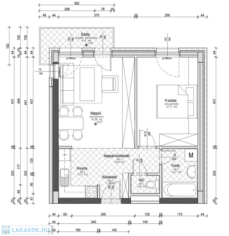 A lakás elrendezése: amerikai konyhás nappali, külön hálószoba, fürdőkádas fürdőszoba és külön WC.