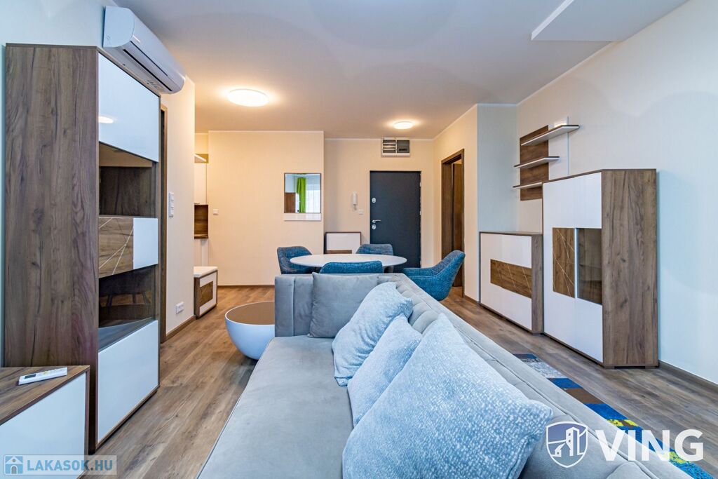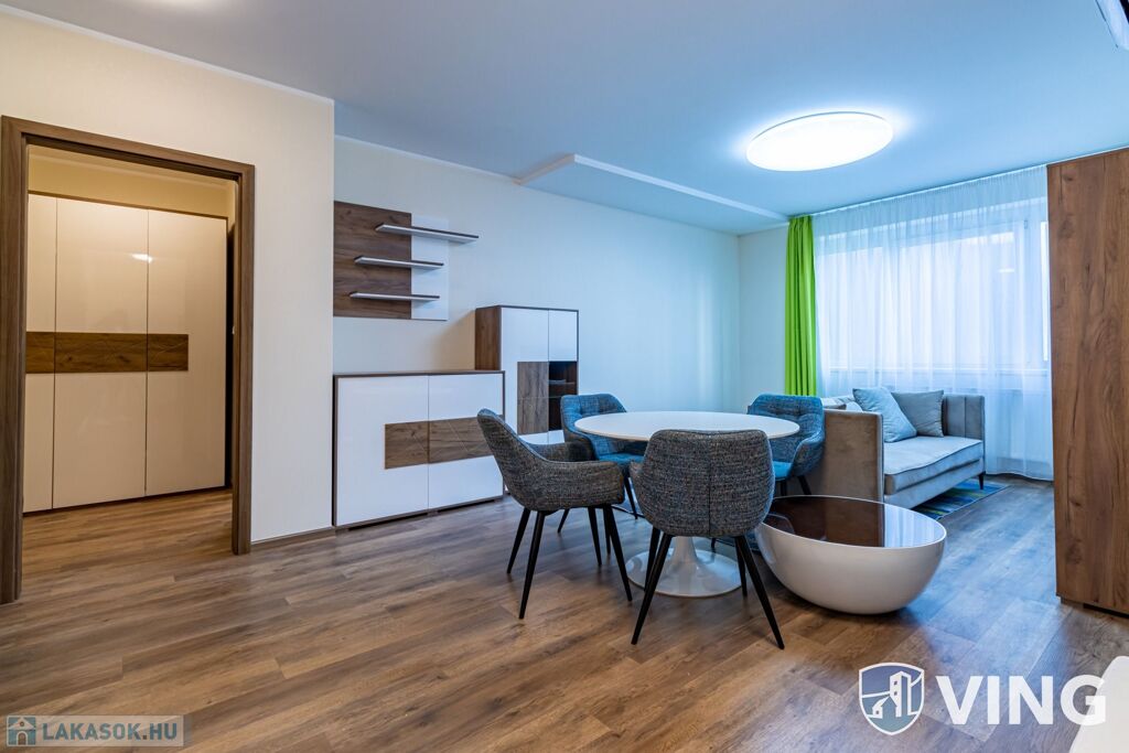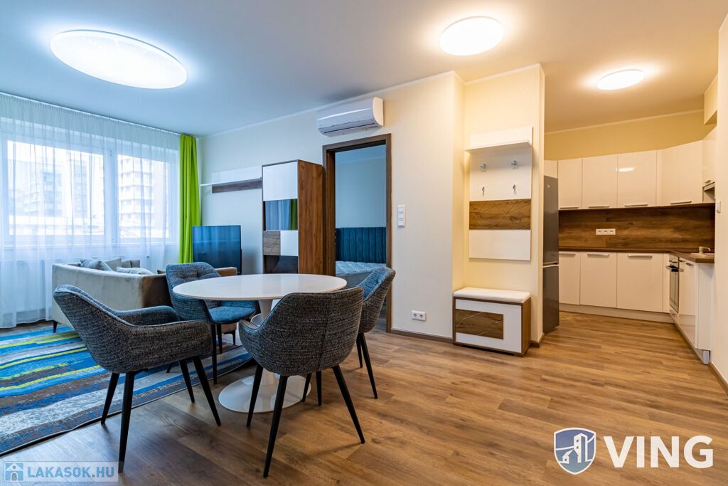 A lakás a képeken látható prémium bútorokkal és gépekkel van esztétikusan berendezve.